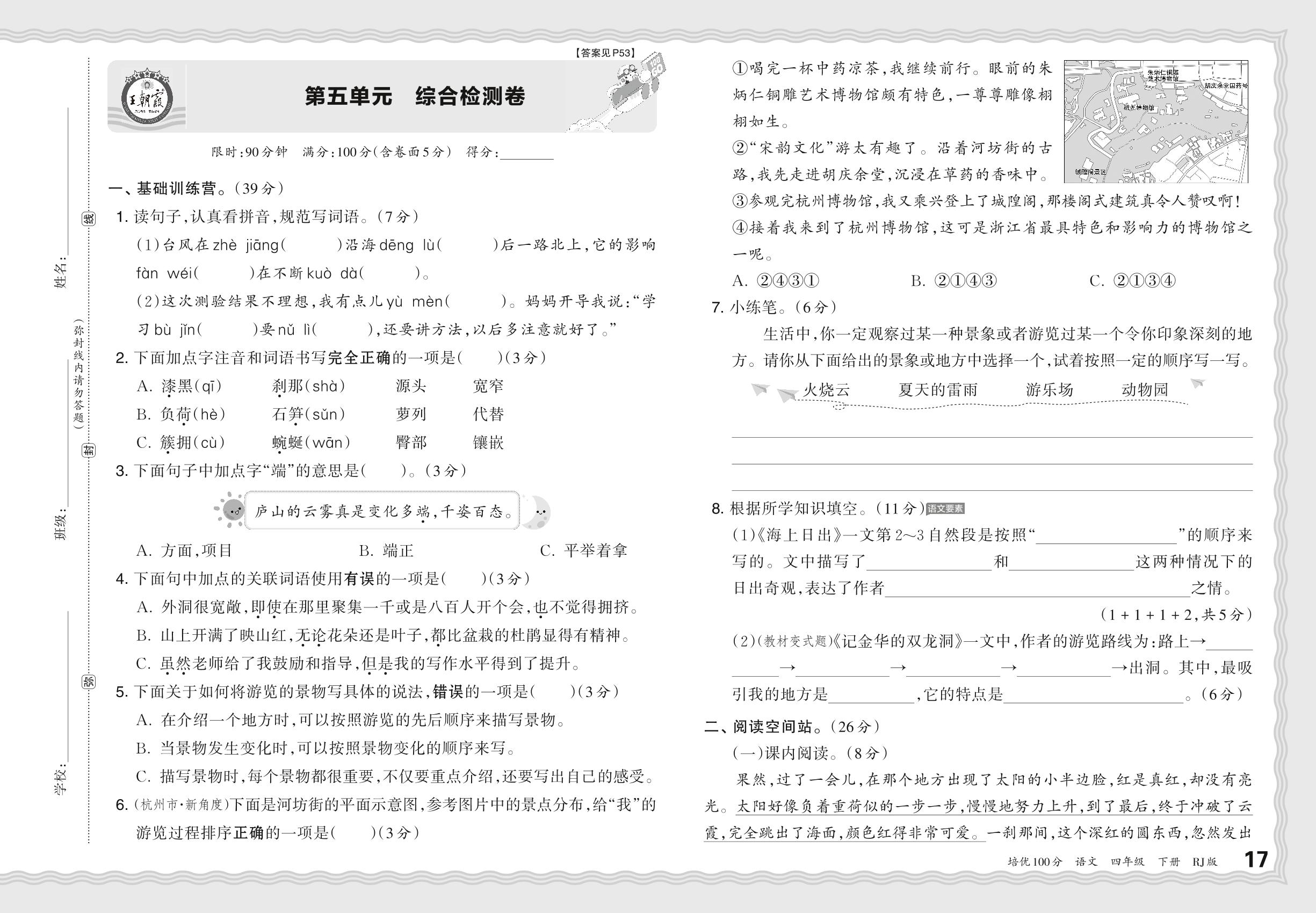 2024春下册四年级语文人教版 第五单元 综合检测卷