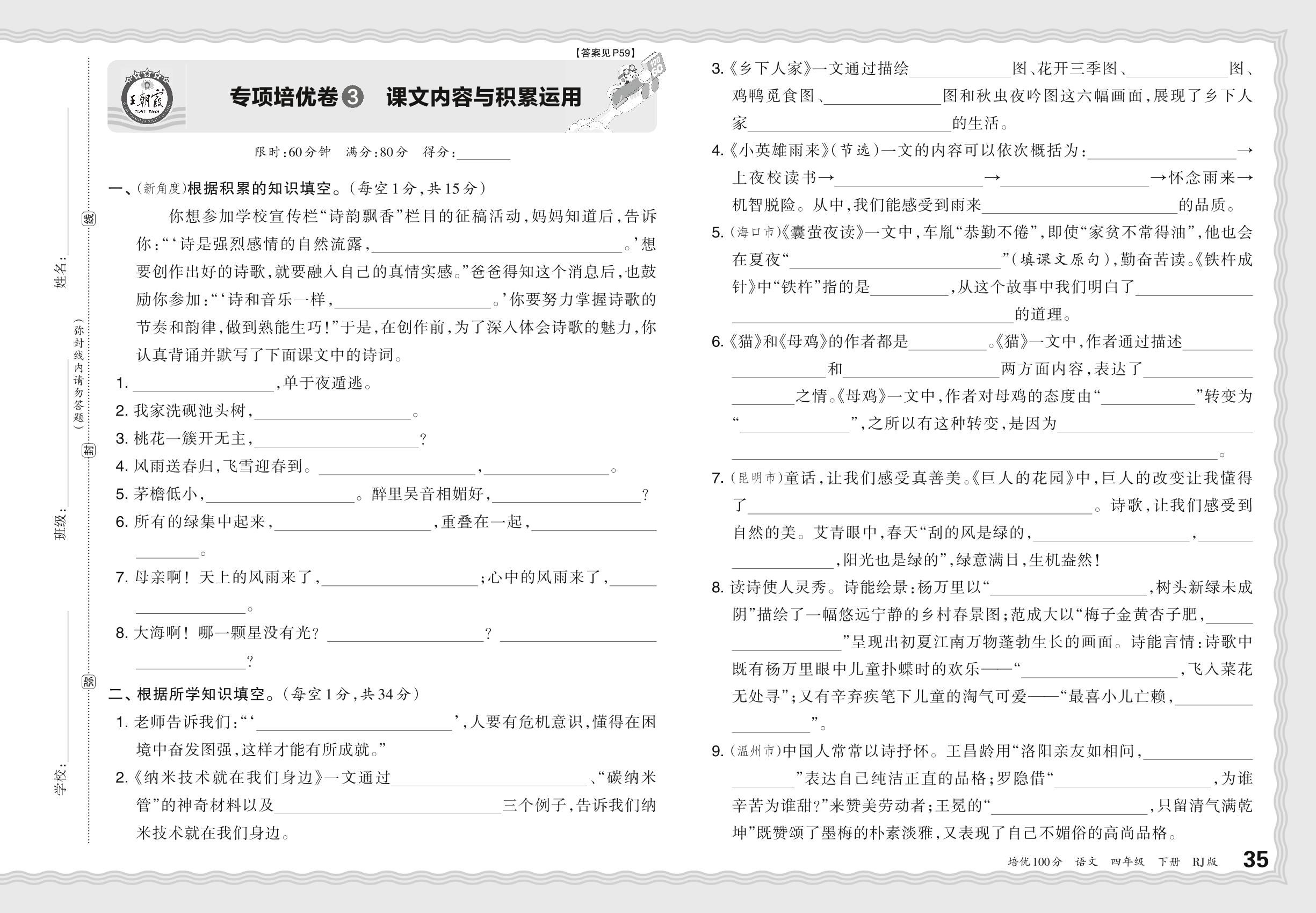 2024春下册四年级语文人教版 期末专项卷PY版·课文内容与积累运用【3】