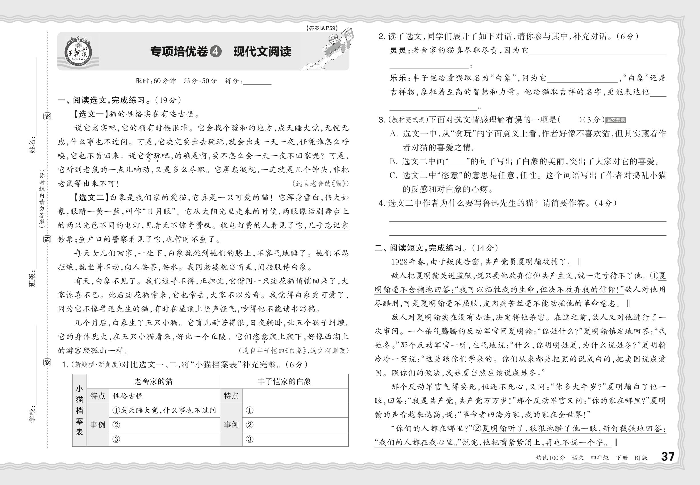2024春下册四年级语文人教版 期末专项卷PY版·现代文阅读【4】