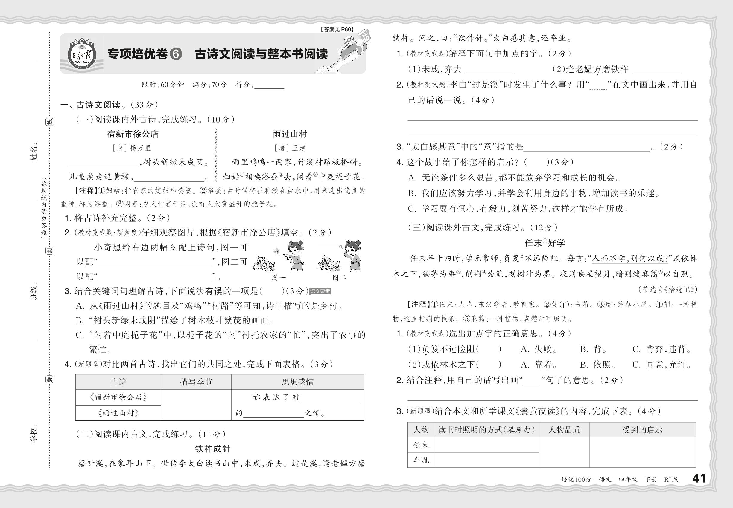 2024春下册四年级语文人教版 期末专项卷PY版·古诗文阅读与整本书阅读【6】