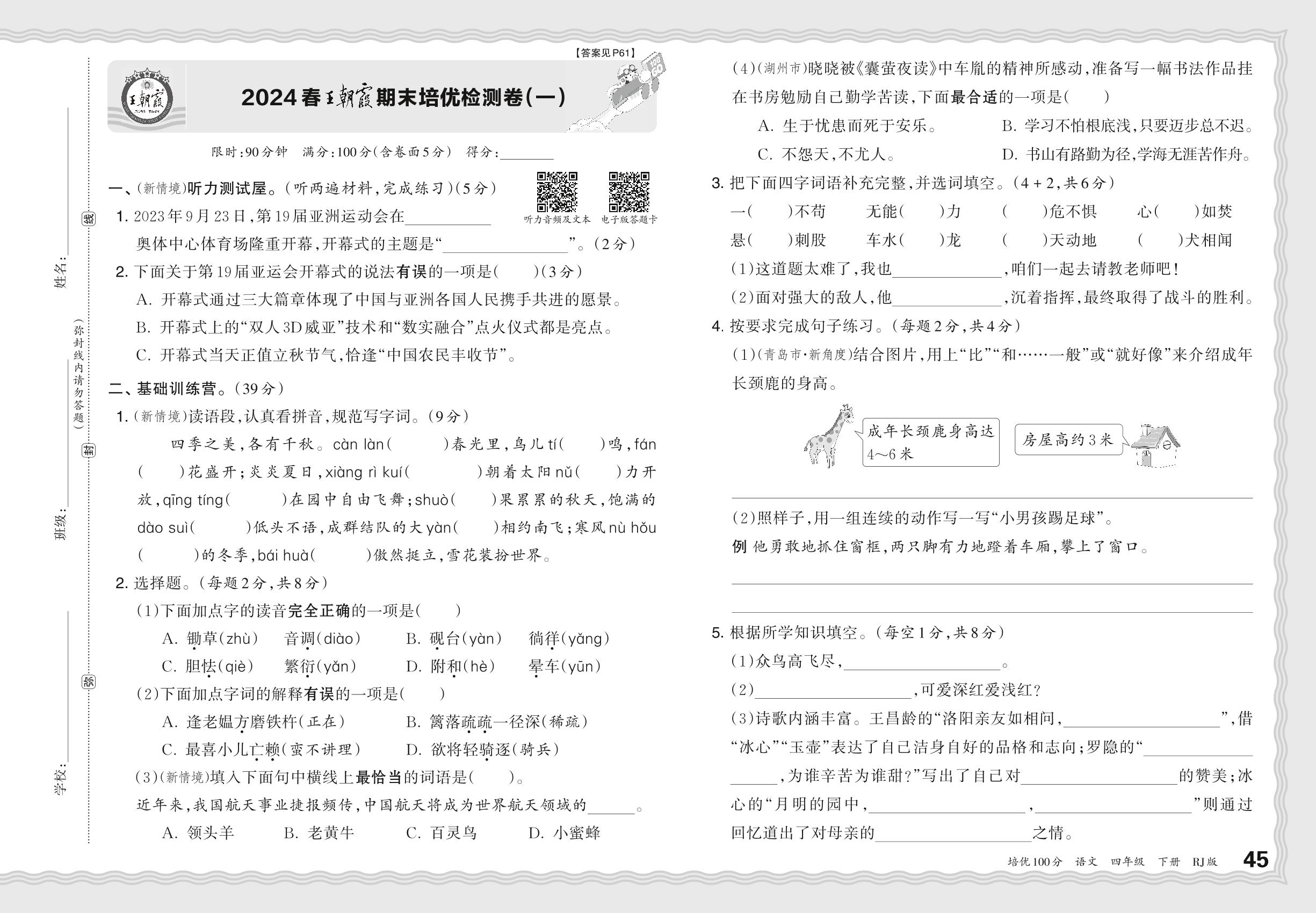 2024春下册四年级语文人教版 王朝霞期末培优检测卷(一)