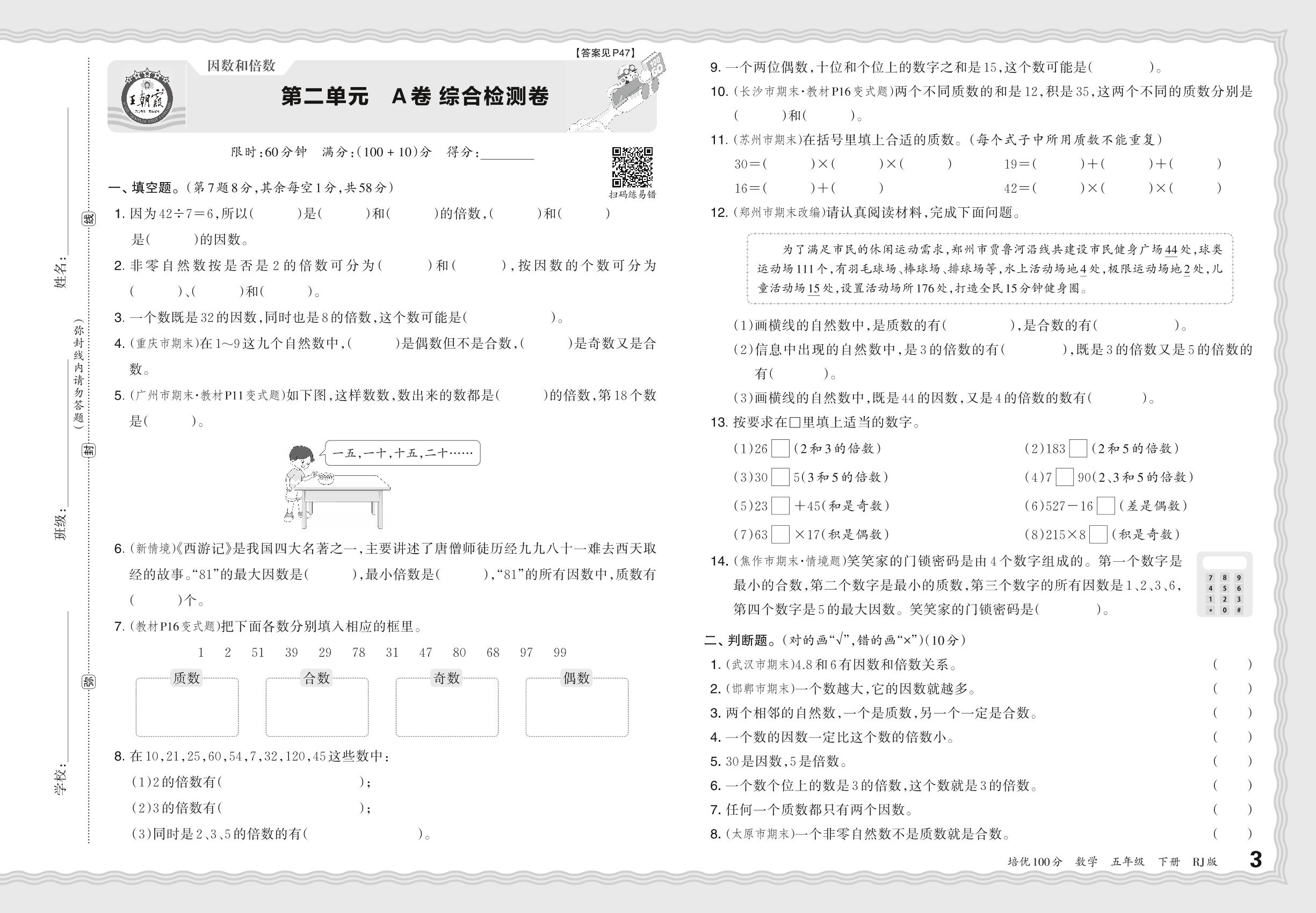 2024春下册五年级数学人教版 第二单元 A卷 综合检测卷