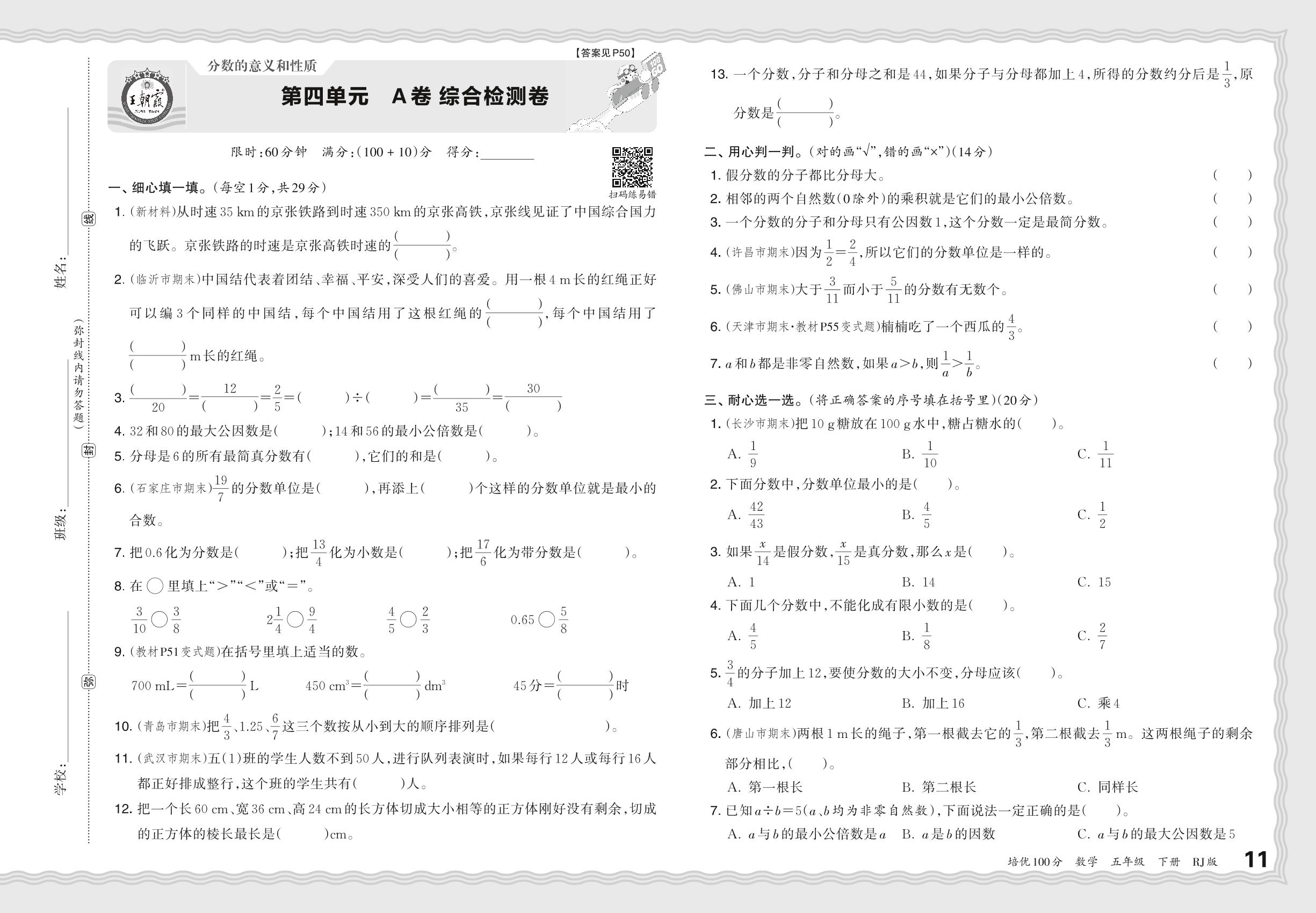 2024春下册五年级数学人教版 第四单元 A卷 综合检测卷