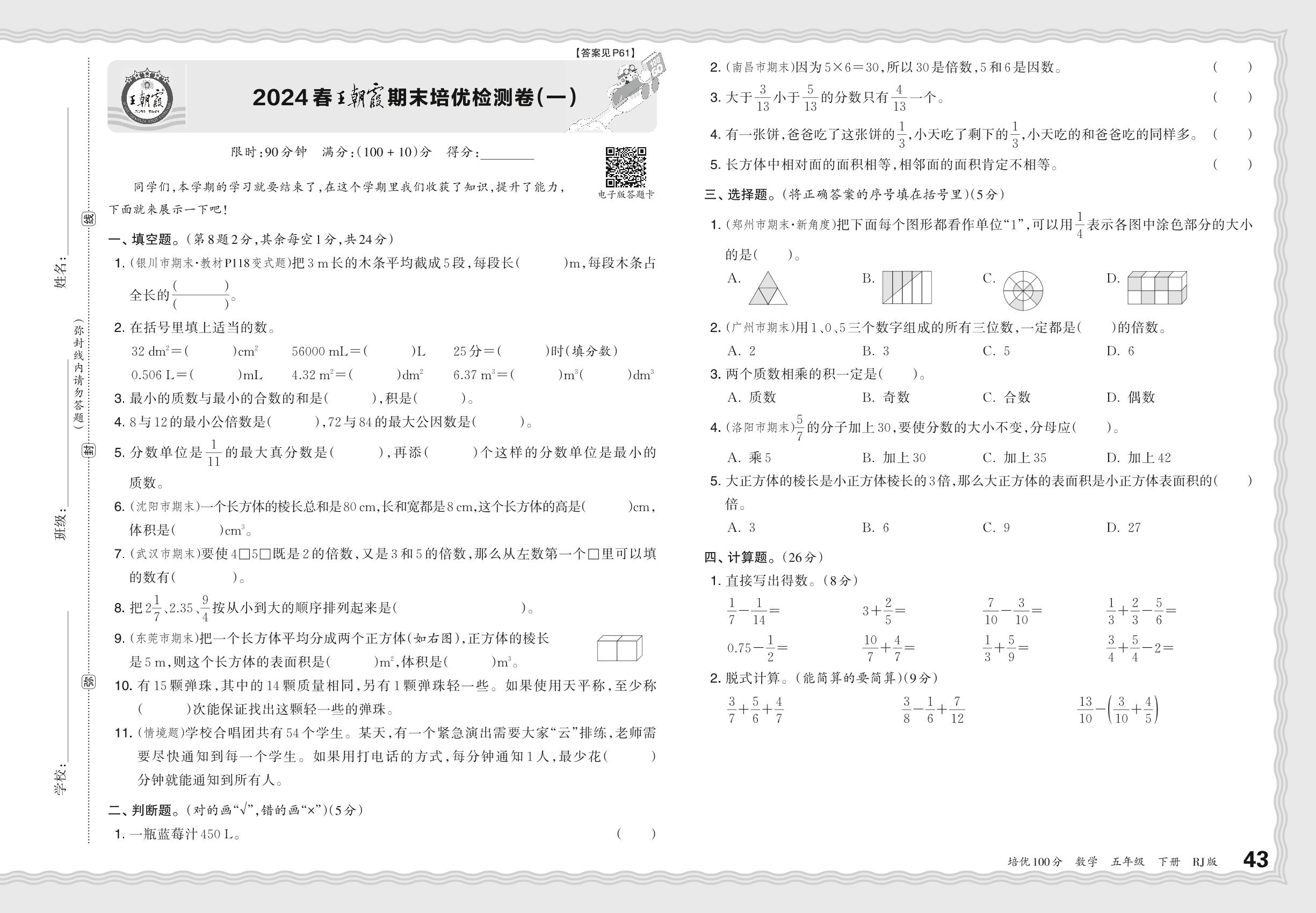 2024春下册五年级数学人教版 王朝霞期末培优检测卷(一)