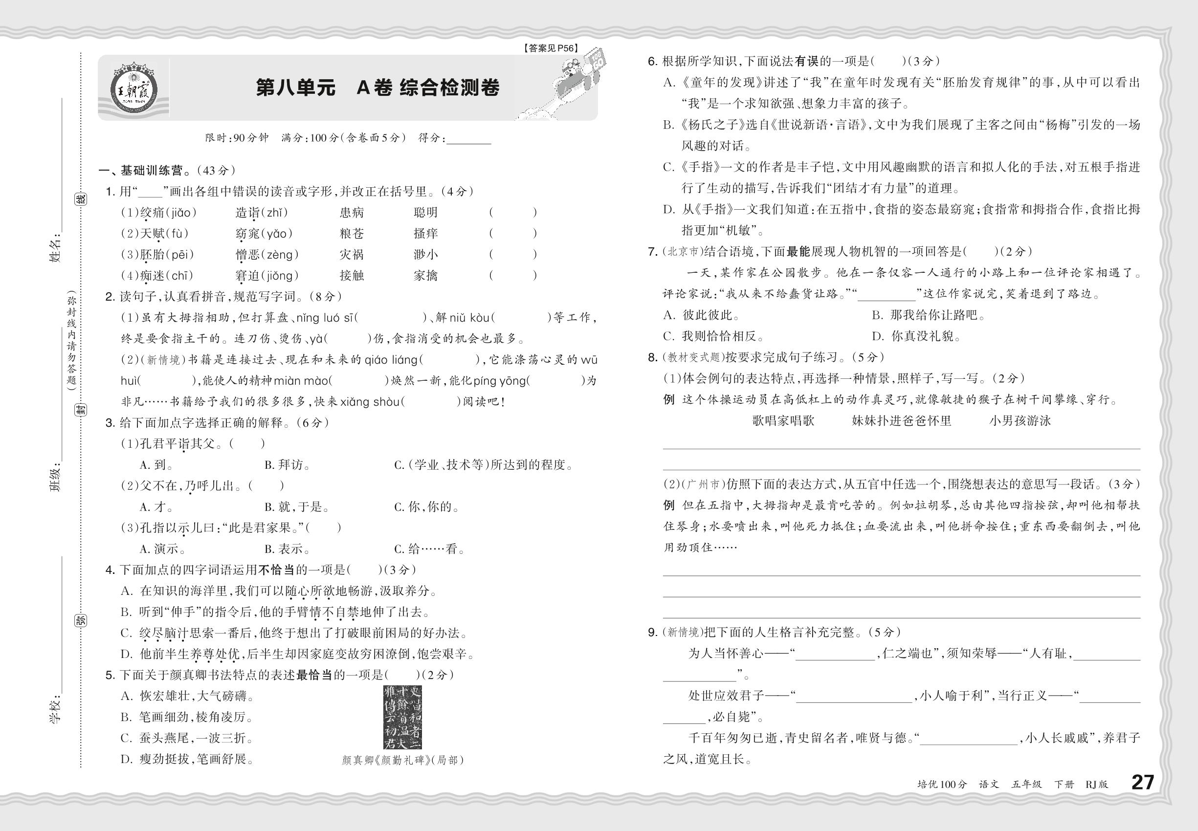 2024春下册五年级语文人教版 第八单元 A卷 综合检测卷