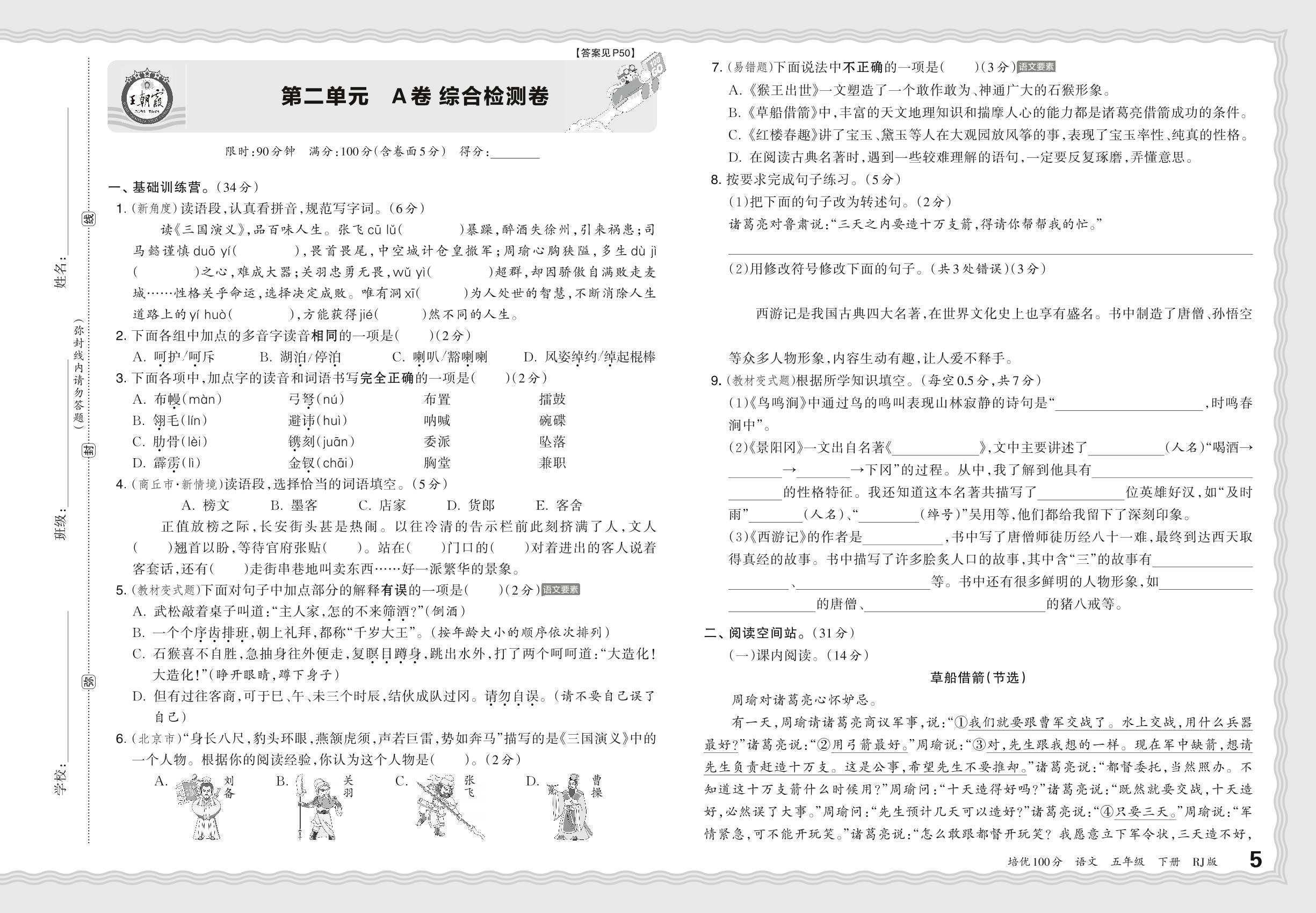 2024春下册五年级语文人教版 第二单元 A卷 综合检测卷