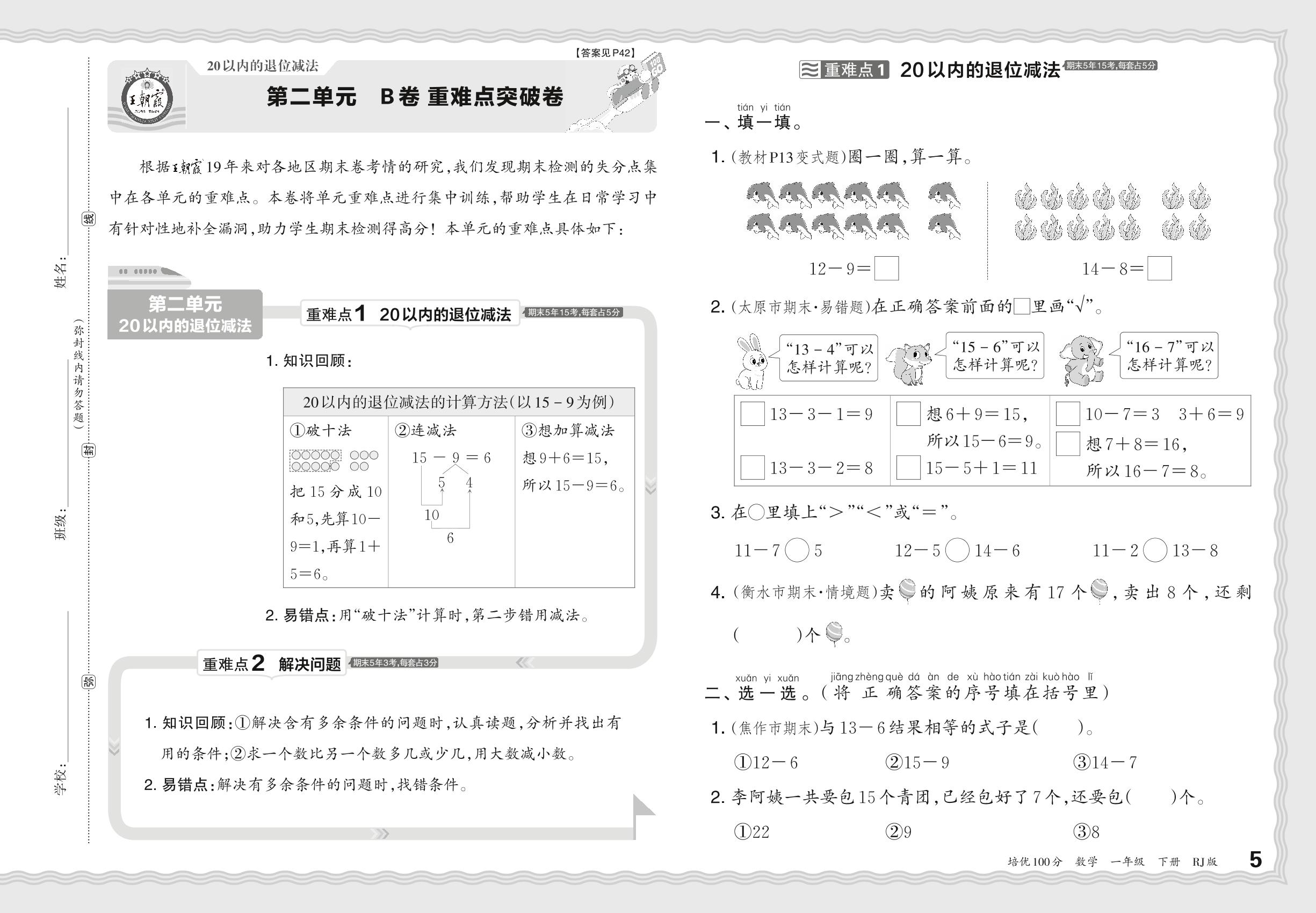 2024春下册一年级数学人教版 第二单元 B卷 重难点突破卷