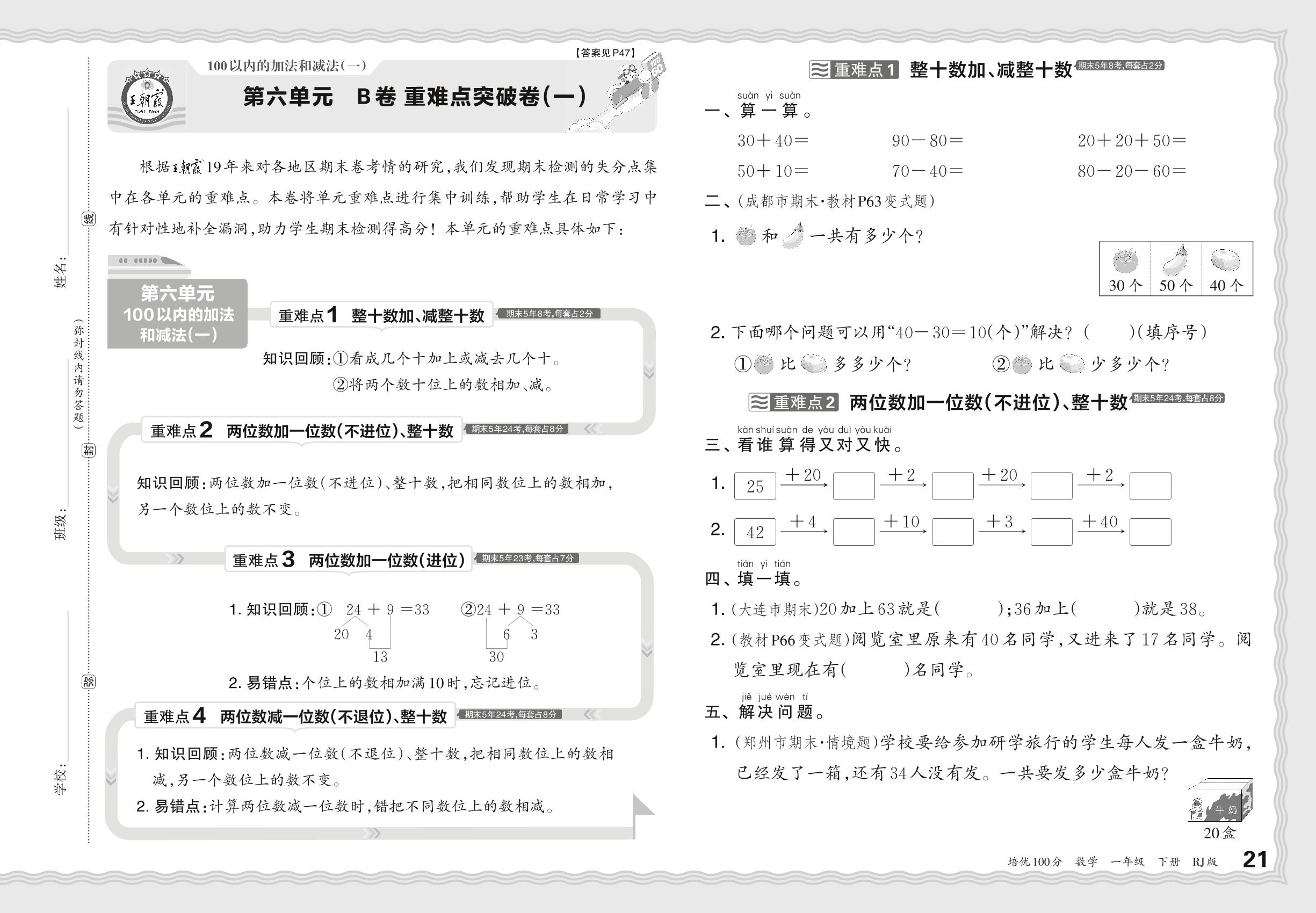 2024春下册一年级数学人教版 第六单元 B卷 重难点突破卷(一)