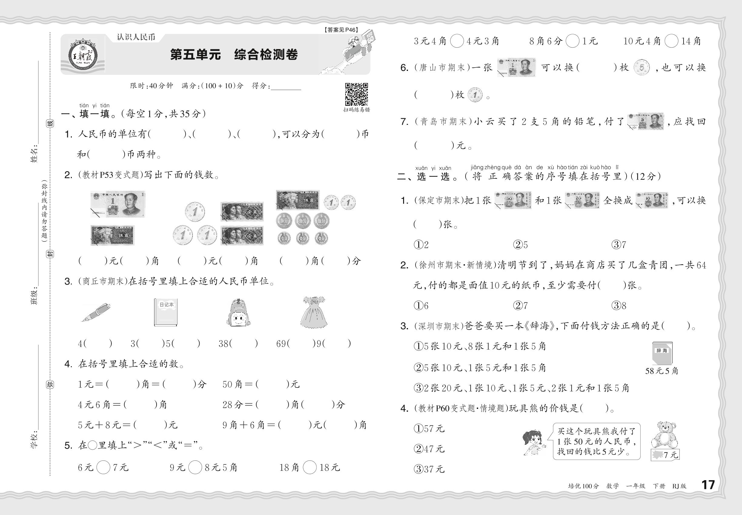 2024春下册一年级数学人教版 第五单元 综合检测卷