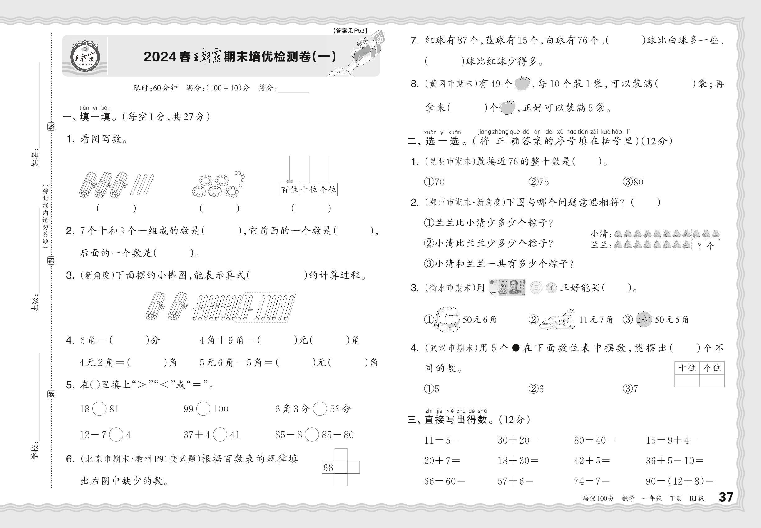 2024春下册一年级数学人教版 王朝霞期末培优检测卷(一)
