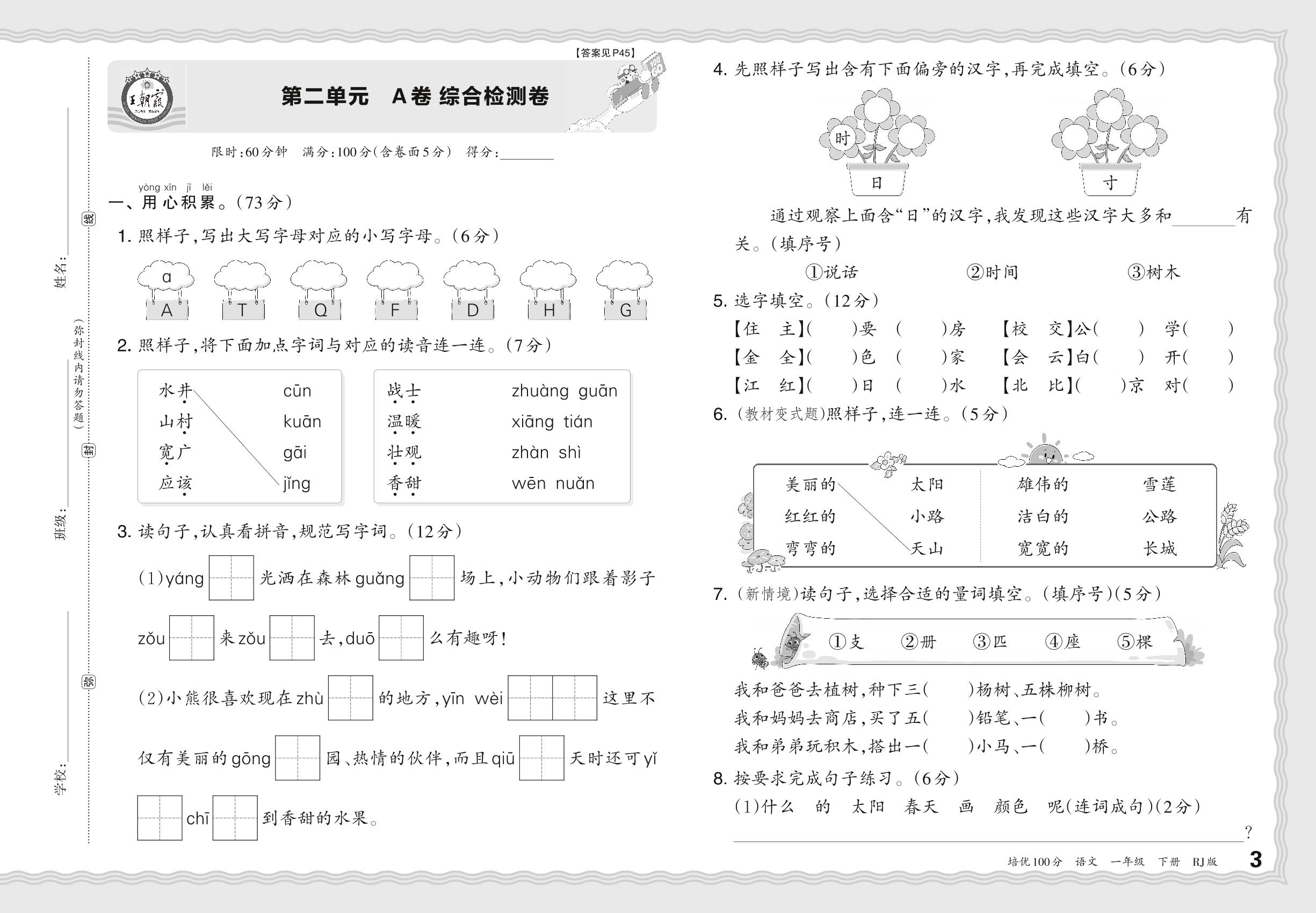 2024春下册一年级语文人教版 第二单元 A卷 综合检测卷