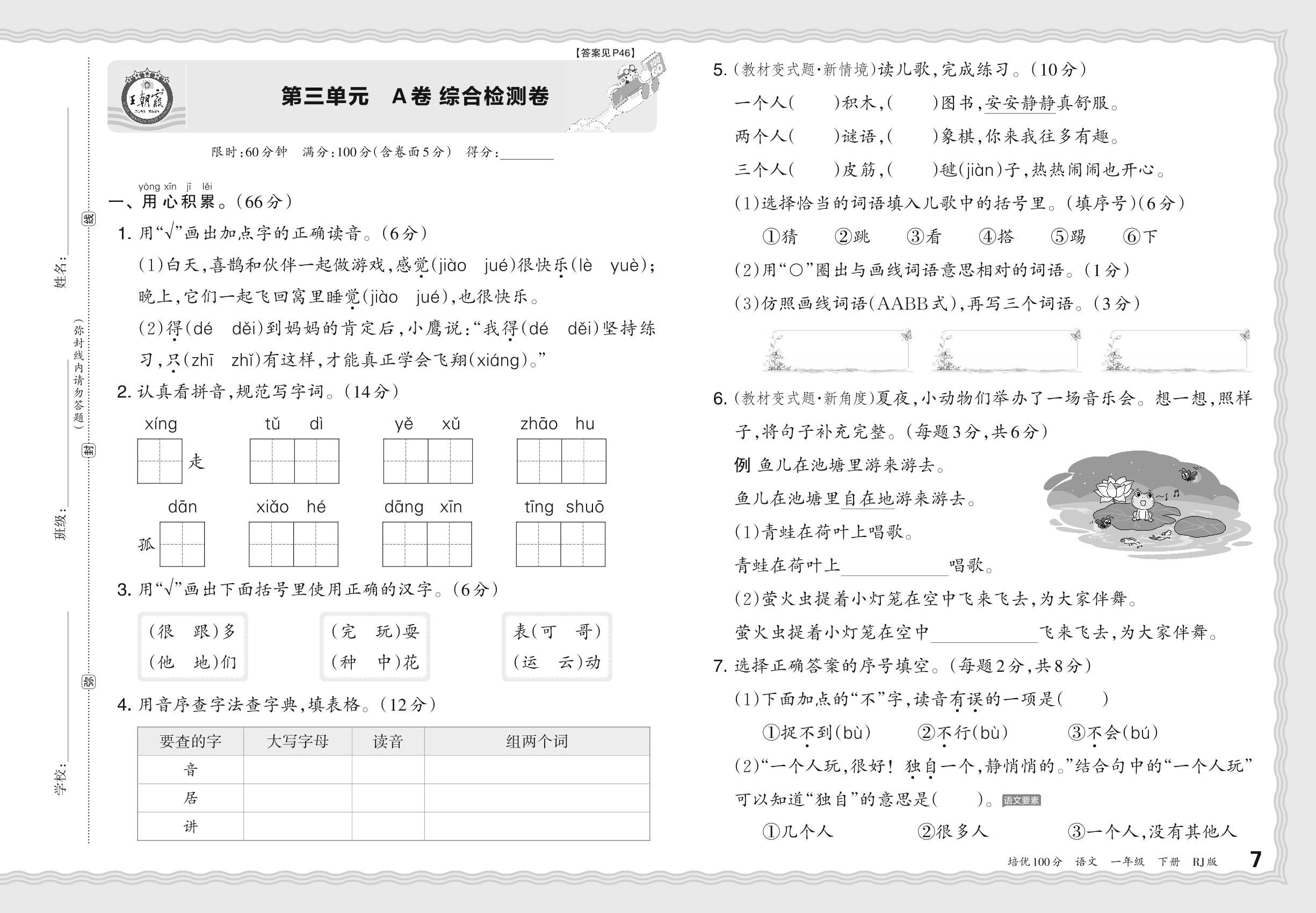 2024春下册一年级语文人教版 第三单元 A卷 综合检测卷