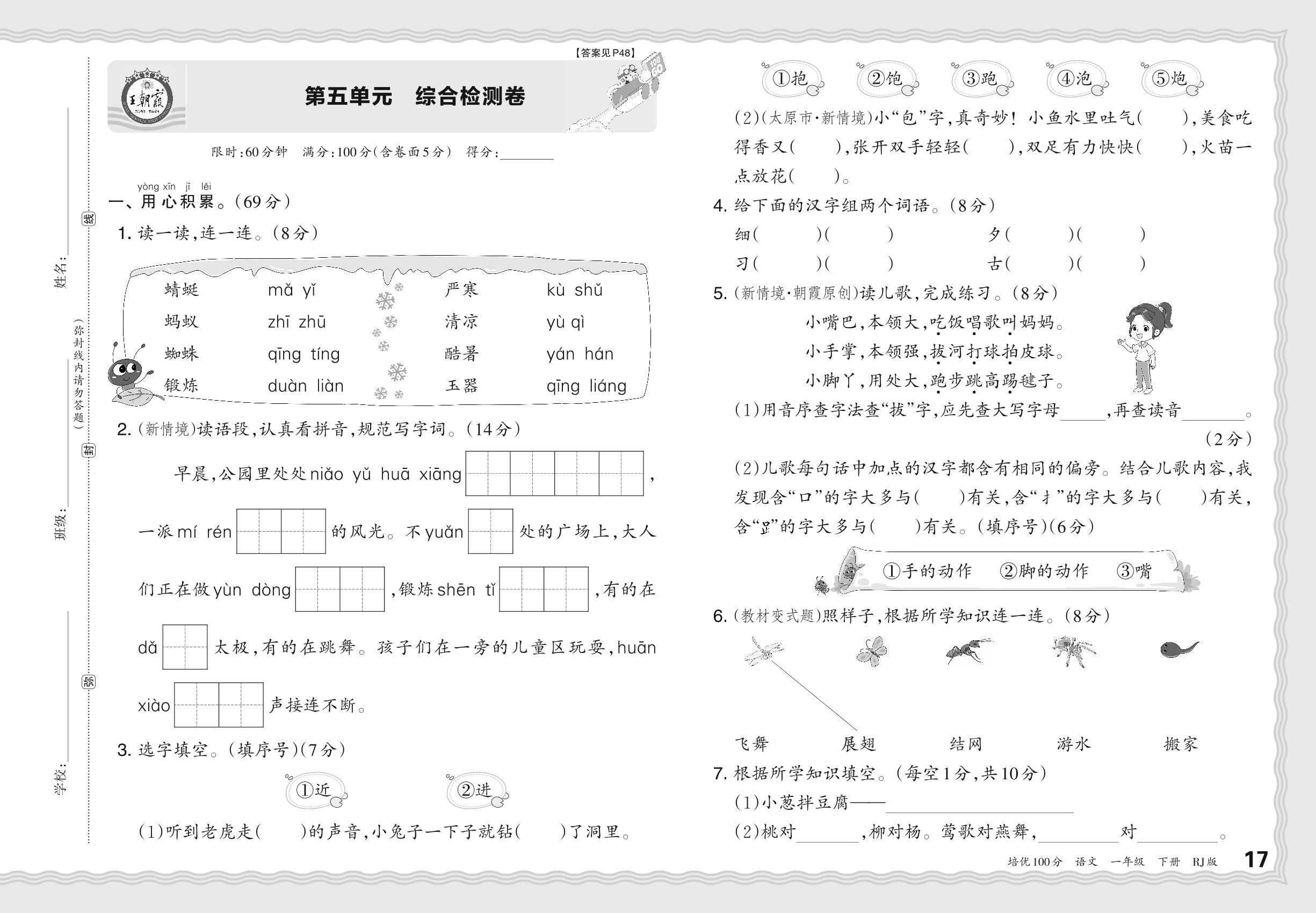 2024春下册一年级语文人教版 第五单元 综合检测卷