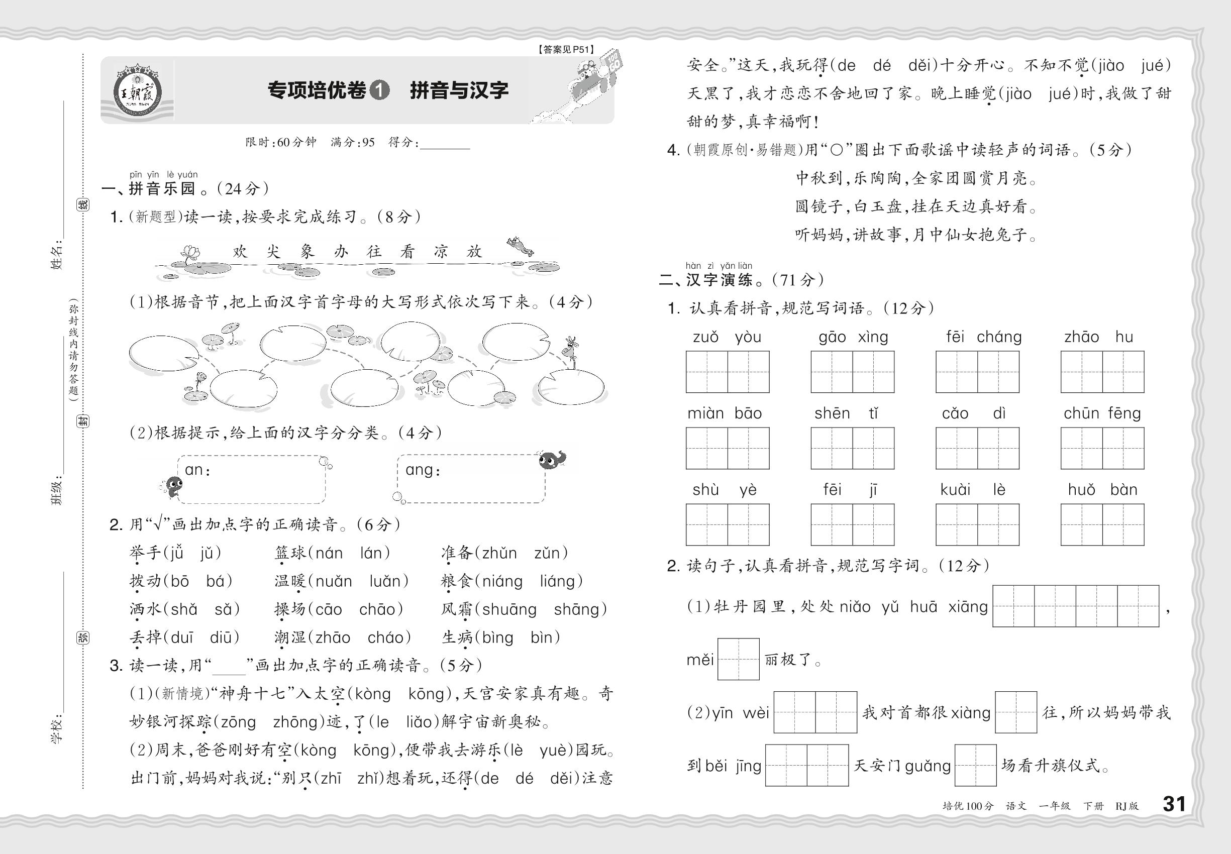 2024春下册一年级语文人教版 期末专项卷PY版·拼音与汉字【1】