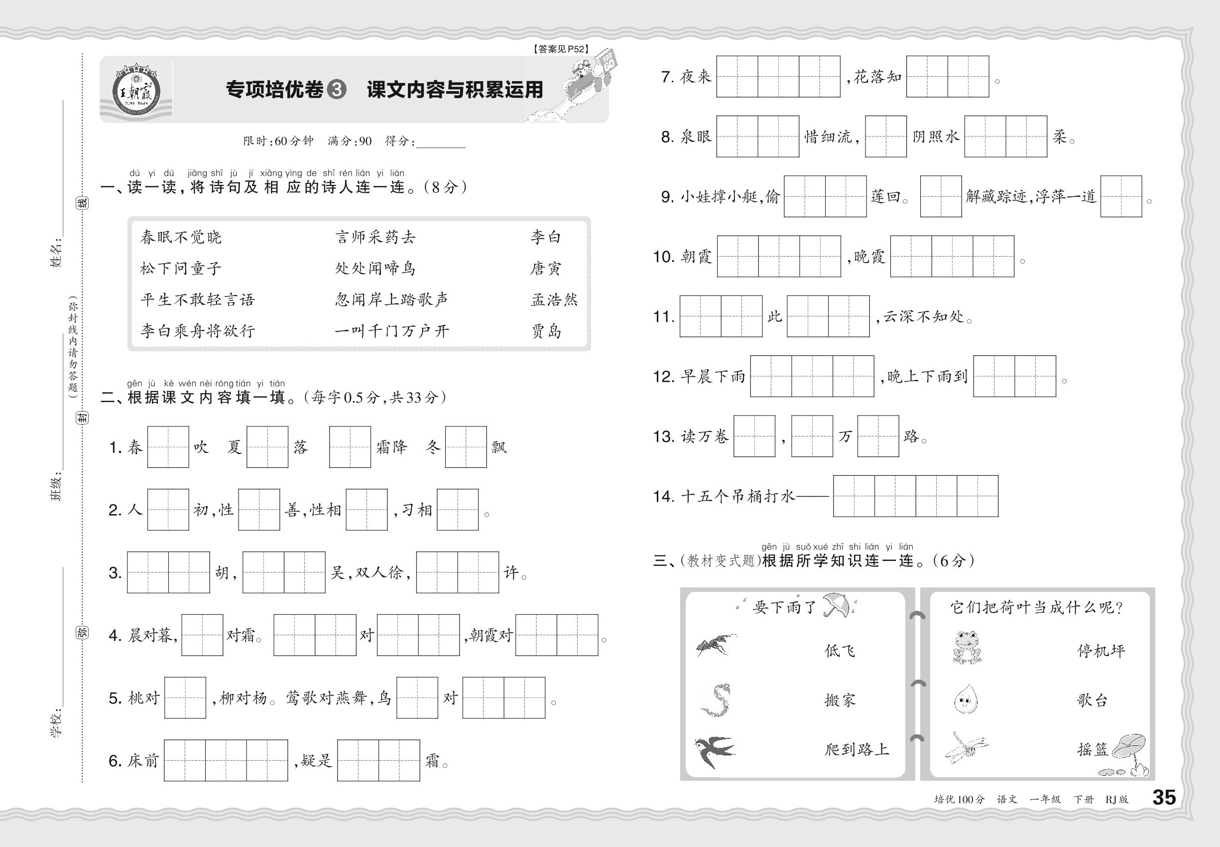 2024春下册一年级语文人教版 期末专项卷PY版·课文内容与积累运用【3】
