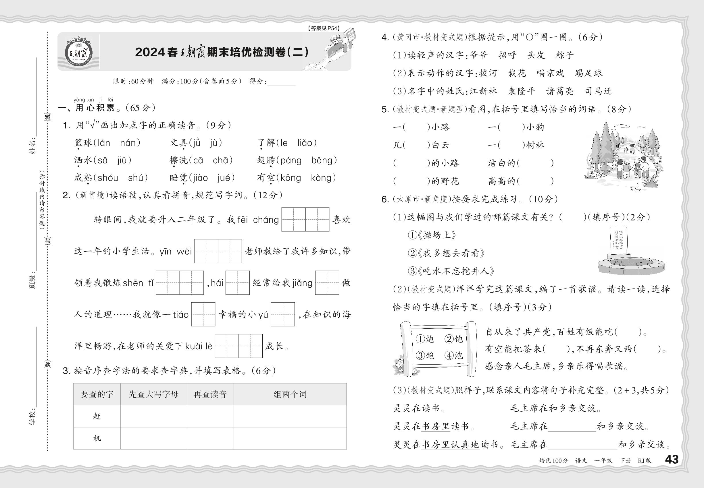 2024春下册一年级语文人教版 王朝霞期末培优检测卷(二)