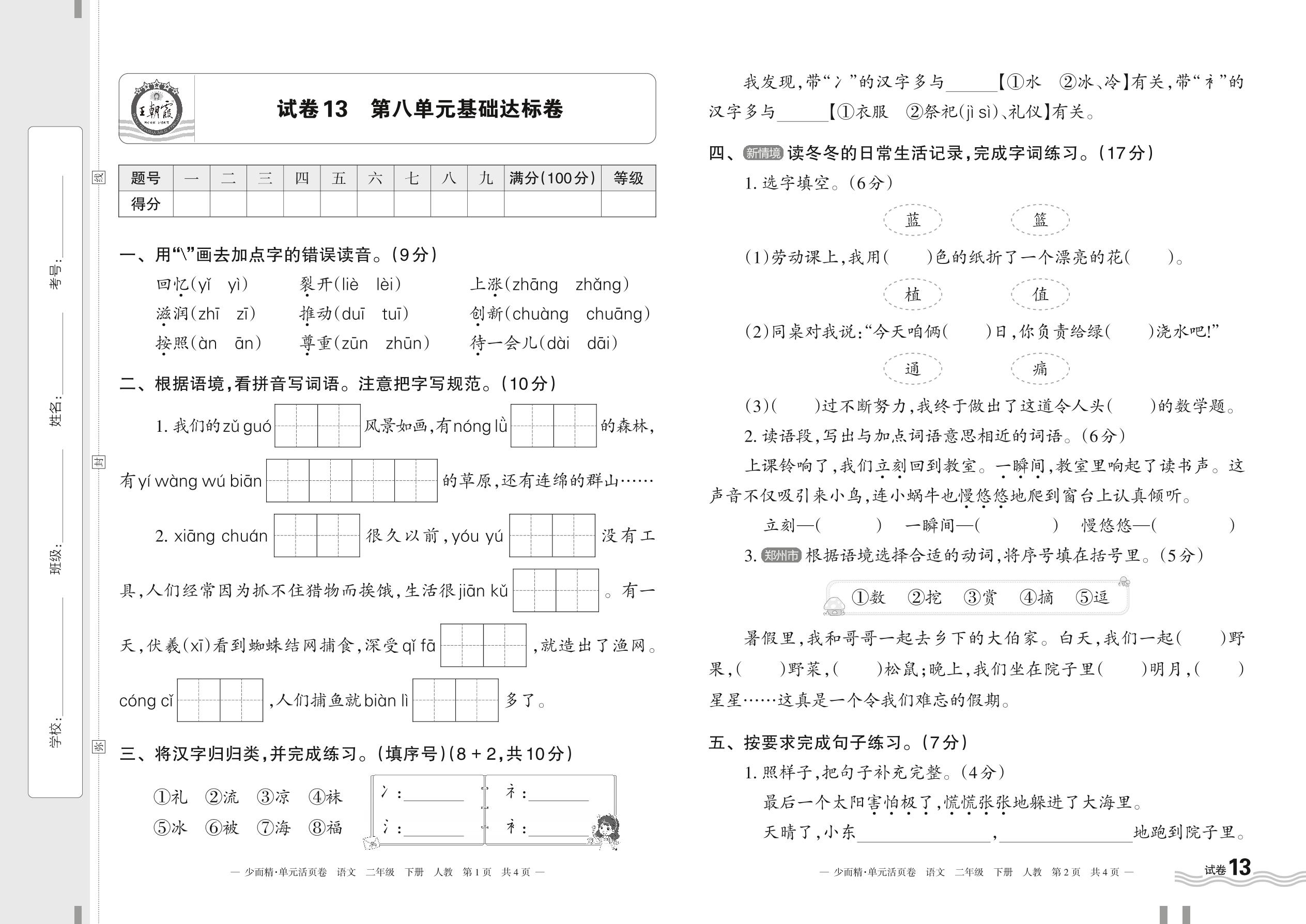 2024春下册二年级语文人教版 第八单元基础达标卷【13】