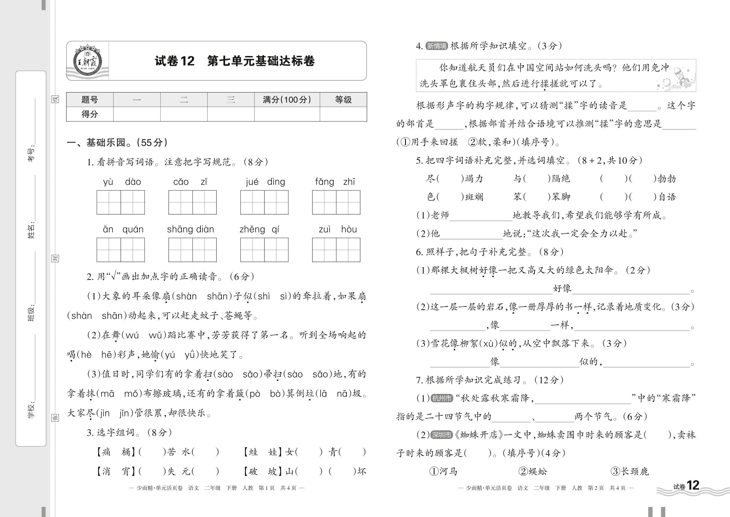 2024春下册二年级语文人教版 第七单元基础达标卷【12】