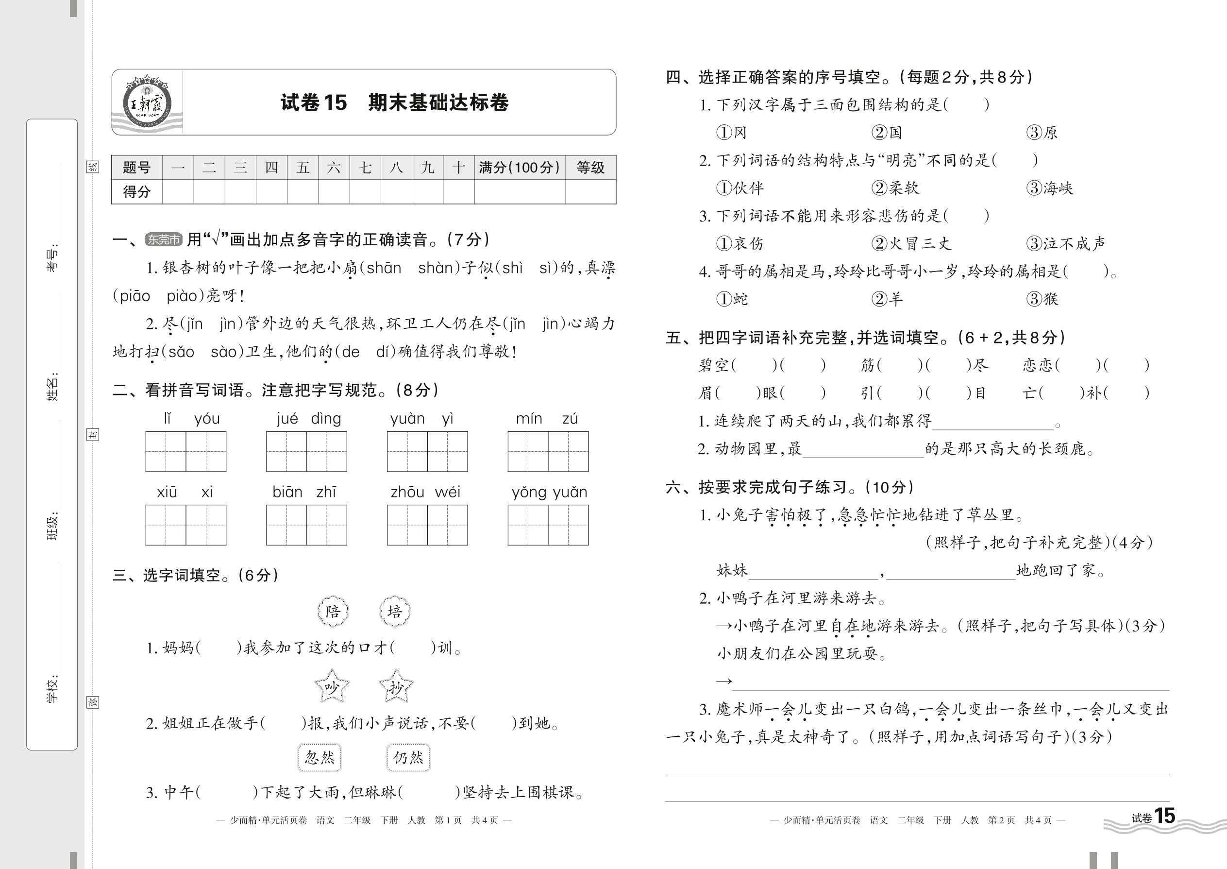 2024春下册二年级语文人教版 期末基础达标卷【15】