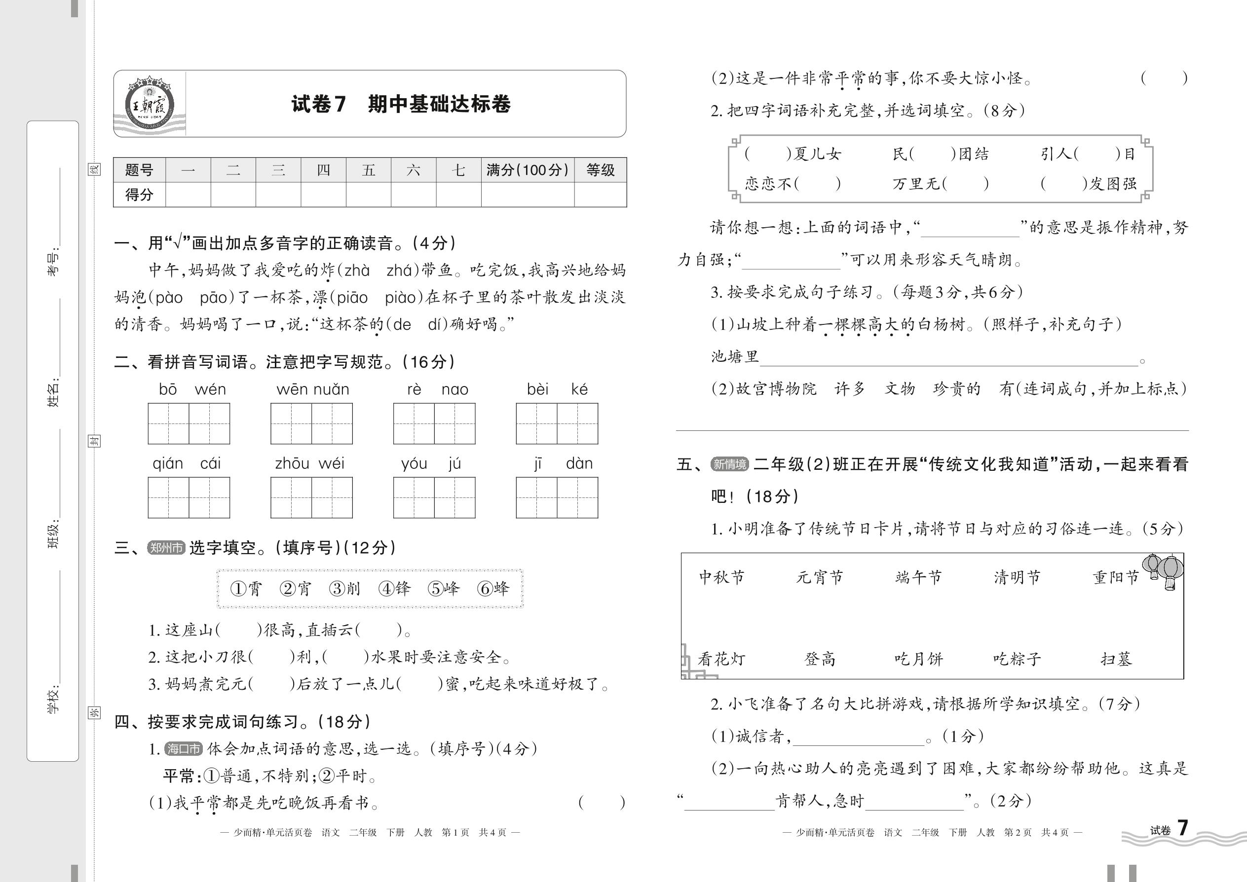 2024春下册二年级语文人教版 期中基础达标卷【7】