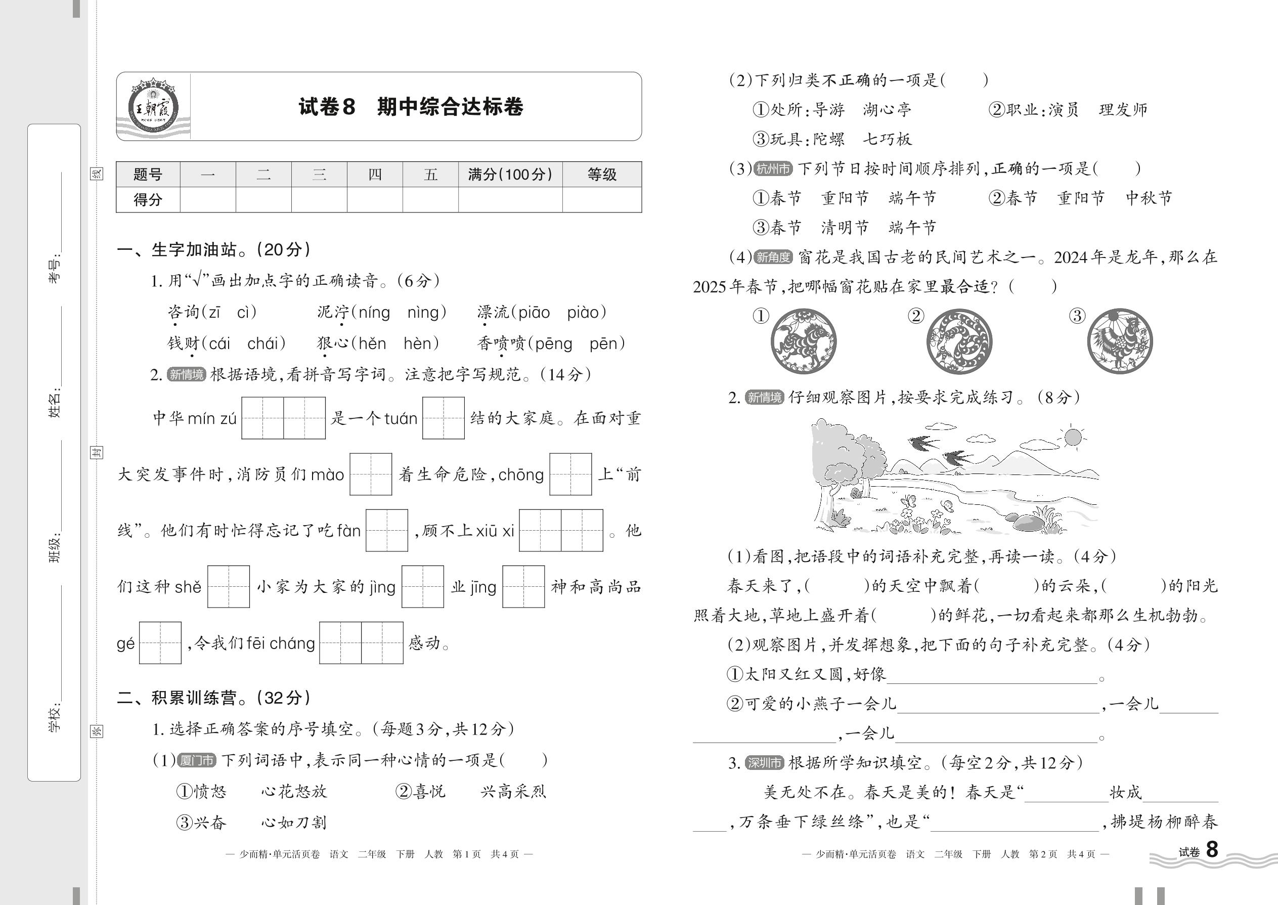 2024春下册二年级语文人教版 期中综合达标卷【8】