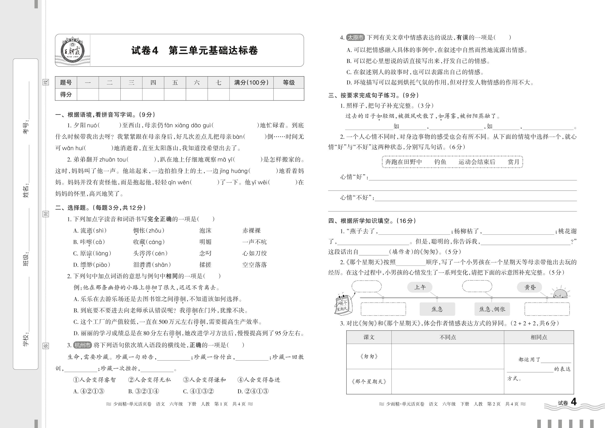 2024春下册六年级语文人教版 第三单元基础达标卷【4】