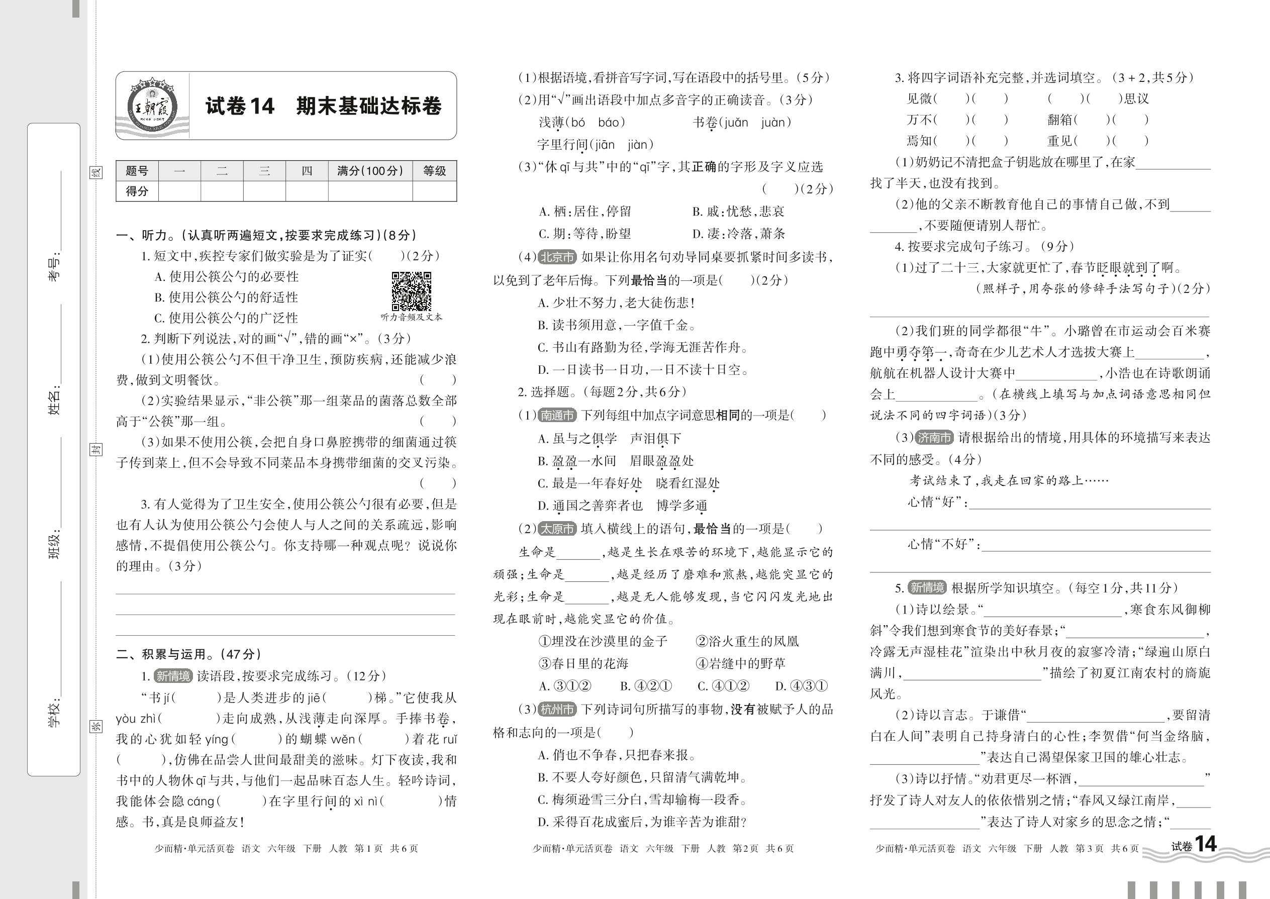 2024春下册六年级语文人教版 期末基础达标卷【14】