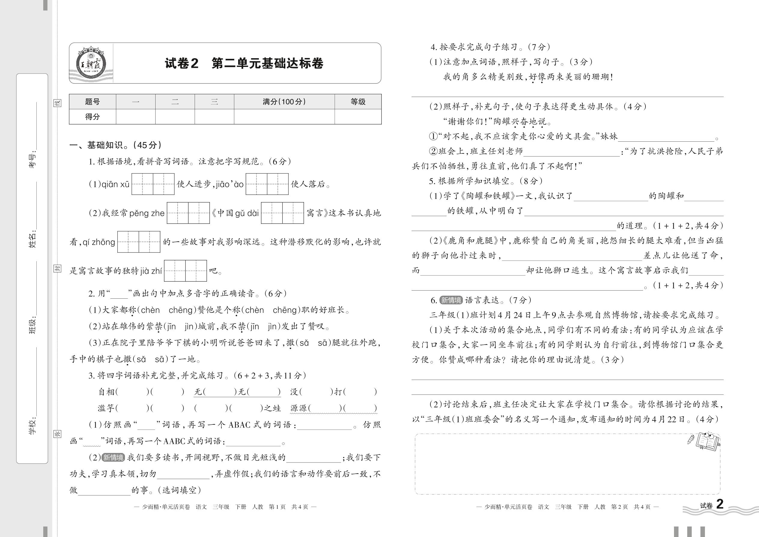 2024春下册三年级语文人教版 第二单元基础达标卷【2】