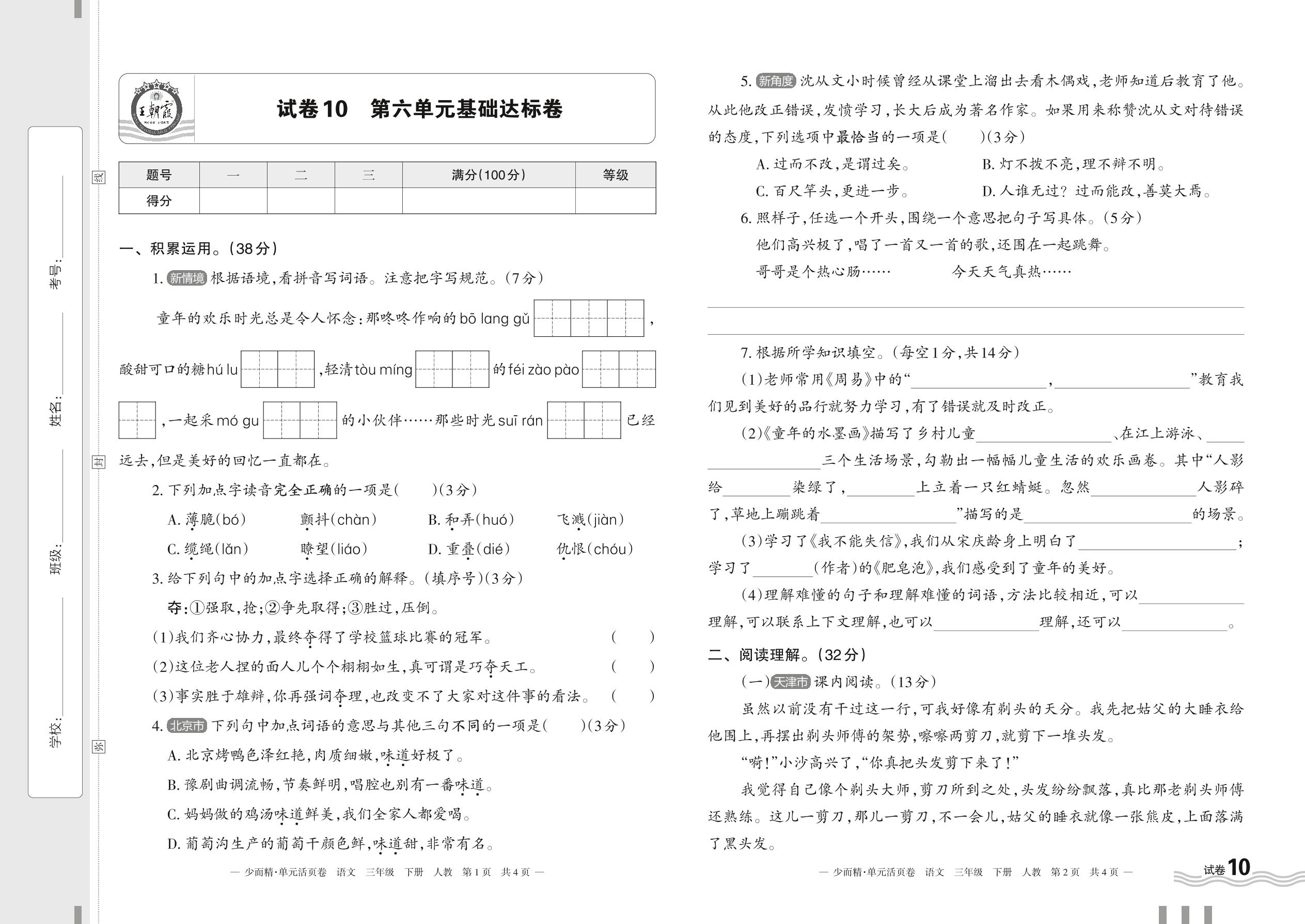 2024春下册三年级语文人教版 第六单元基础达标卷【10】