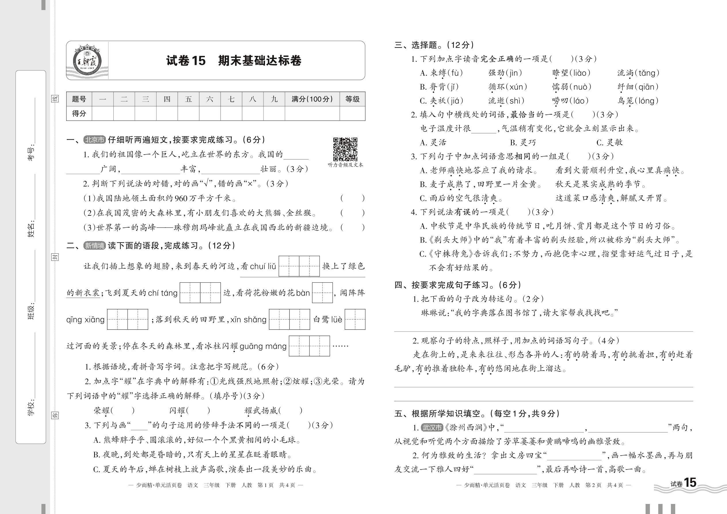 2024春下册三年级语文人教版 期末基础达标卷【15】