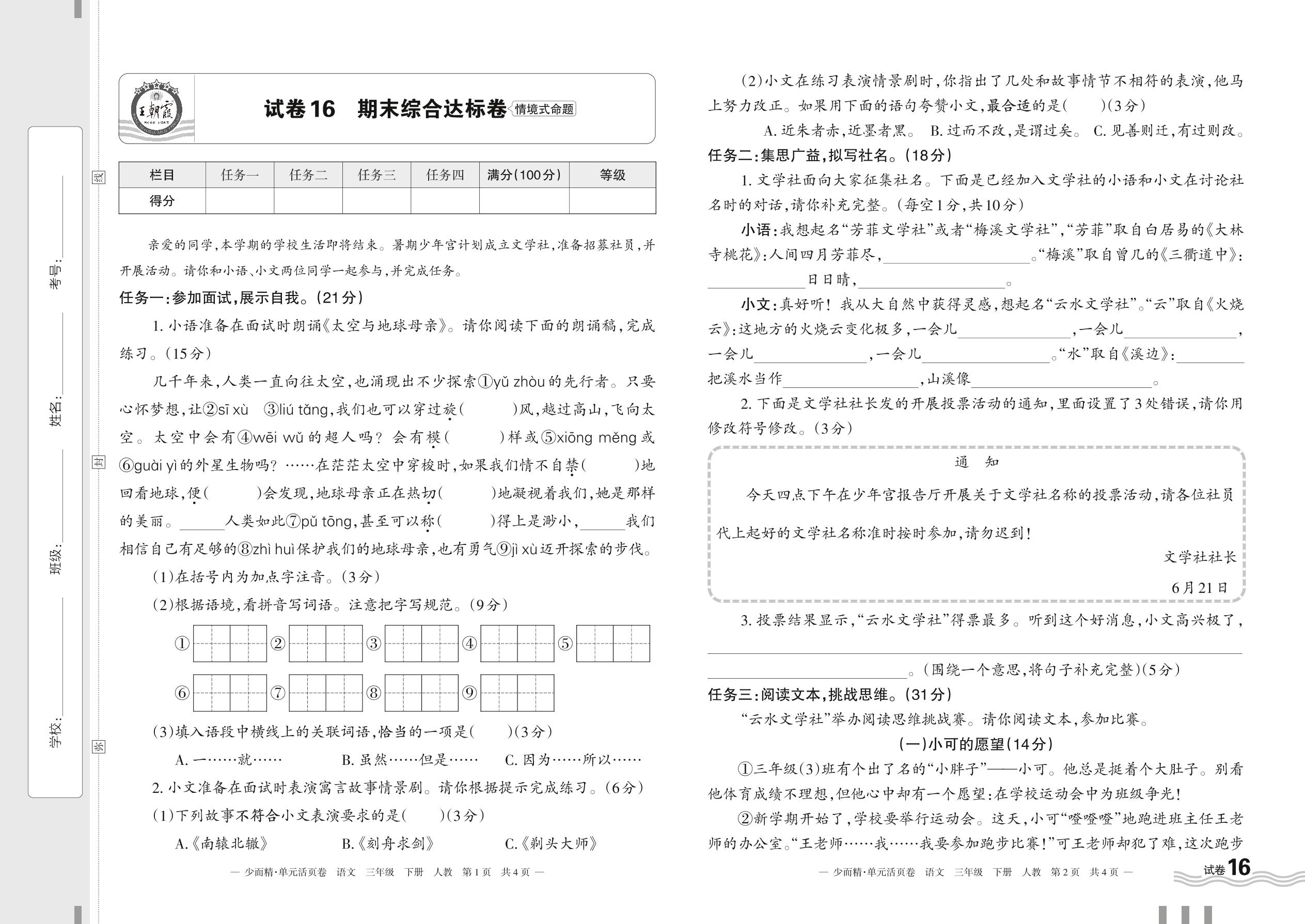 2024春下册三年级语文人教版 期末综合达标卷【16】