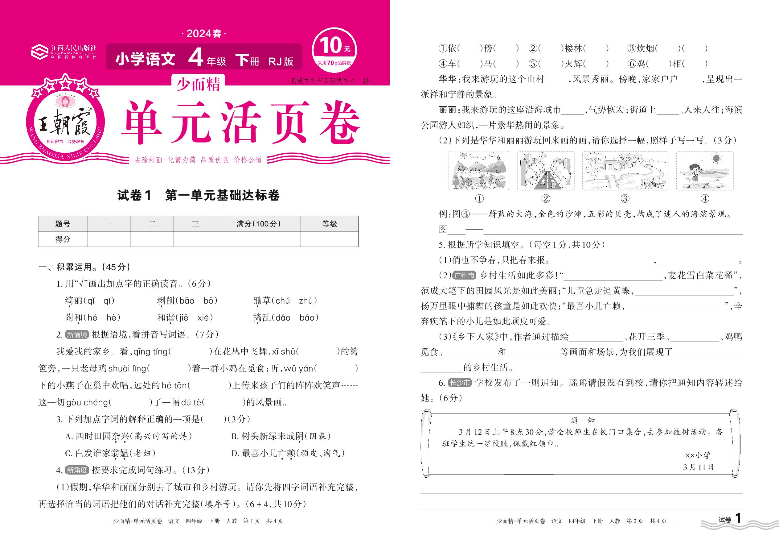 2024春下册四年级语文人教版 第一单元基础达标卷【1】