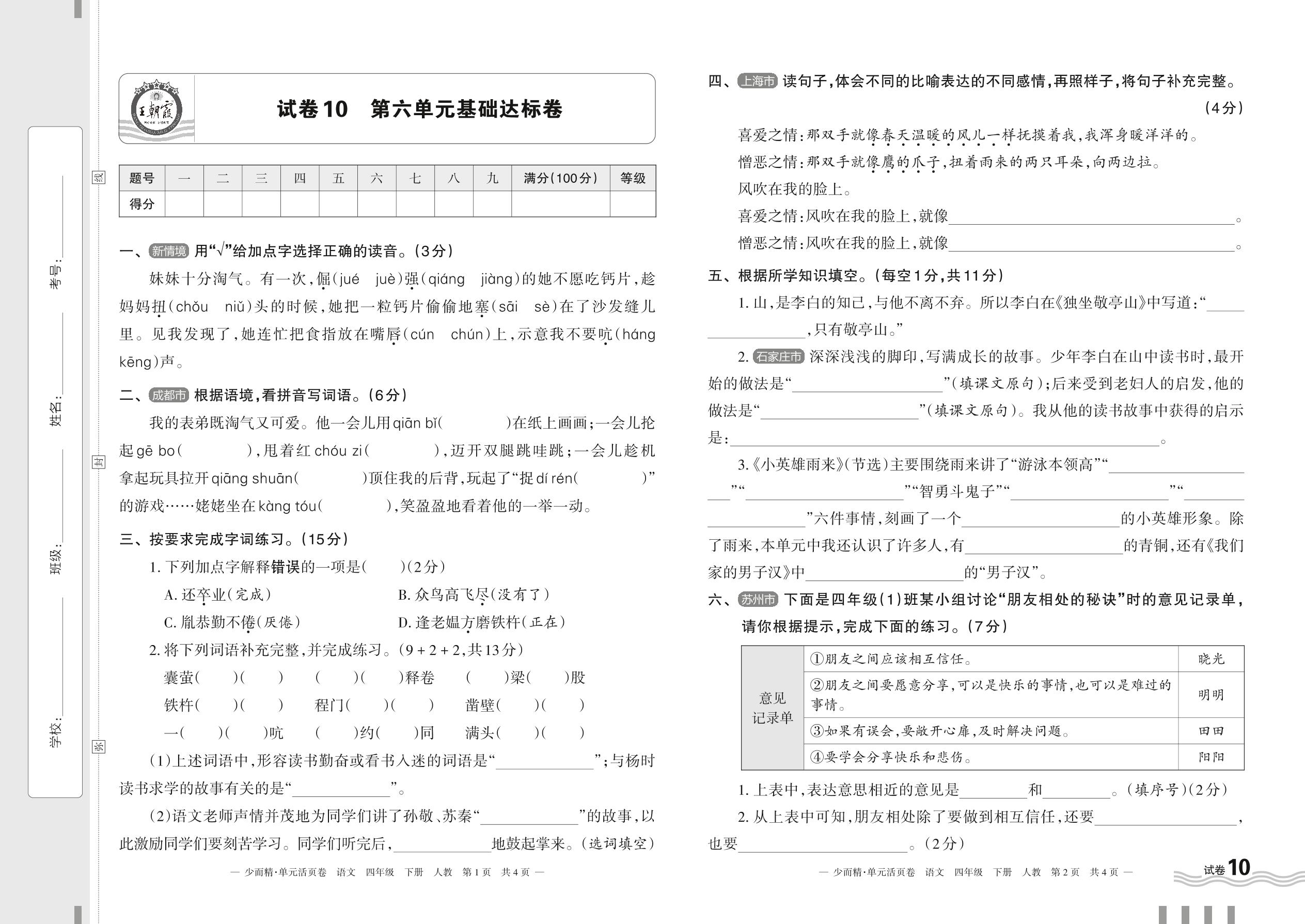 四年级语文人教版下册单元卷