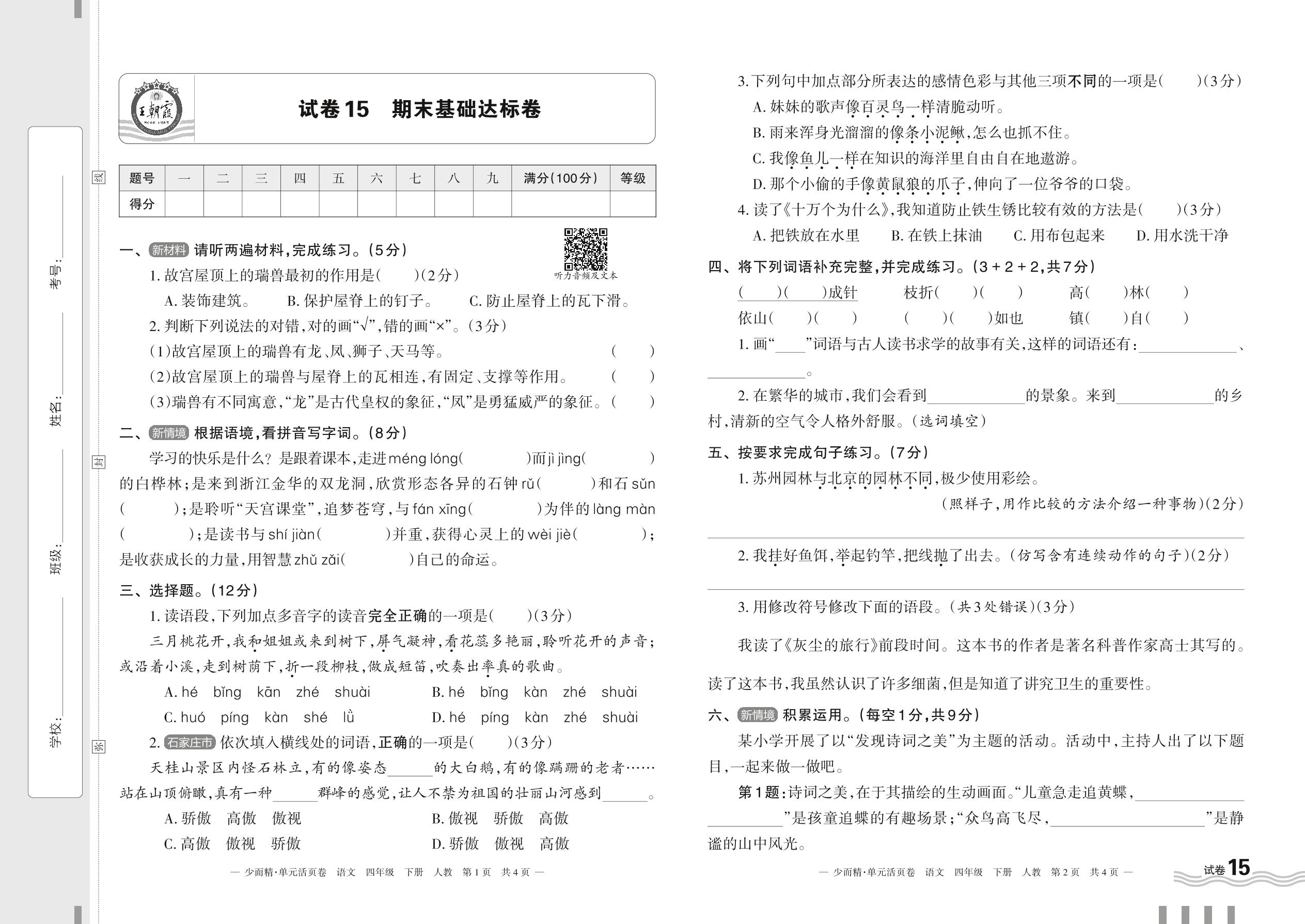 2024春下册四年级语文人教版 期末基础达标卷【15】