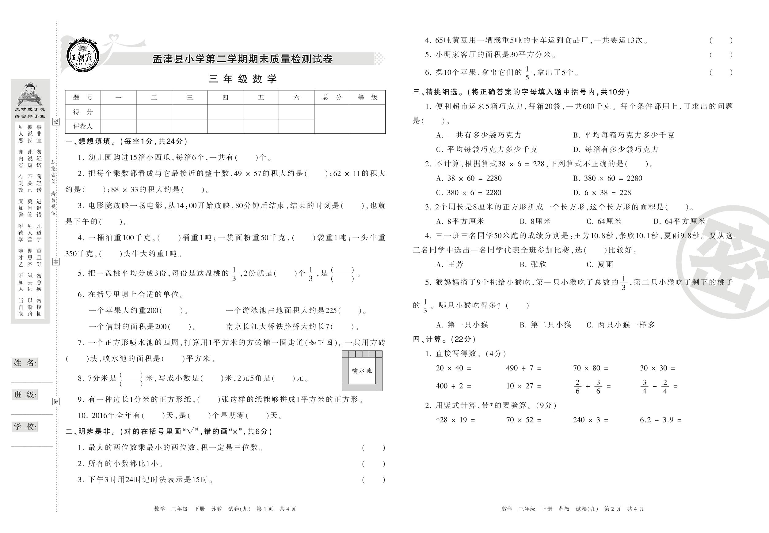 2015-2016学年第二学期洛阳市孟津县三年级数学试卷(苏教版)【9】