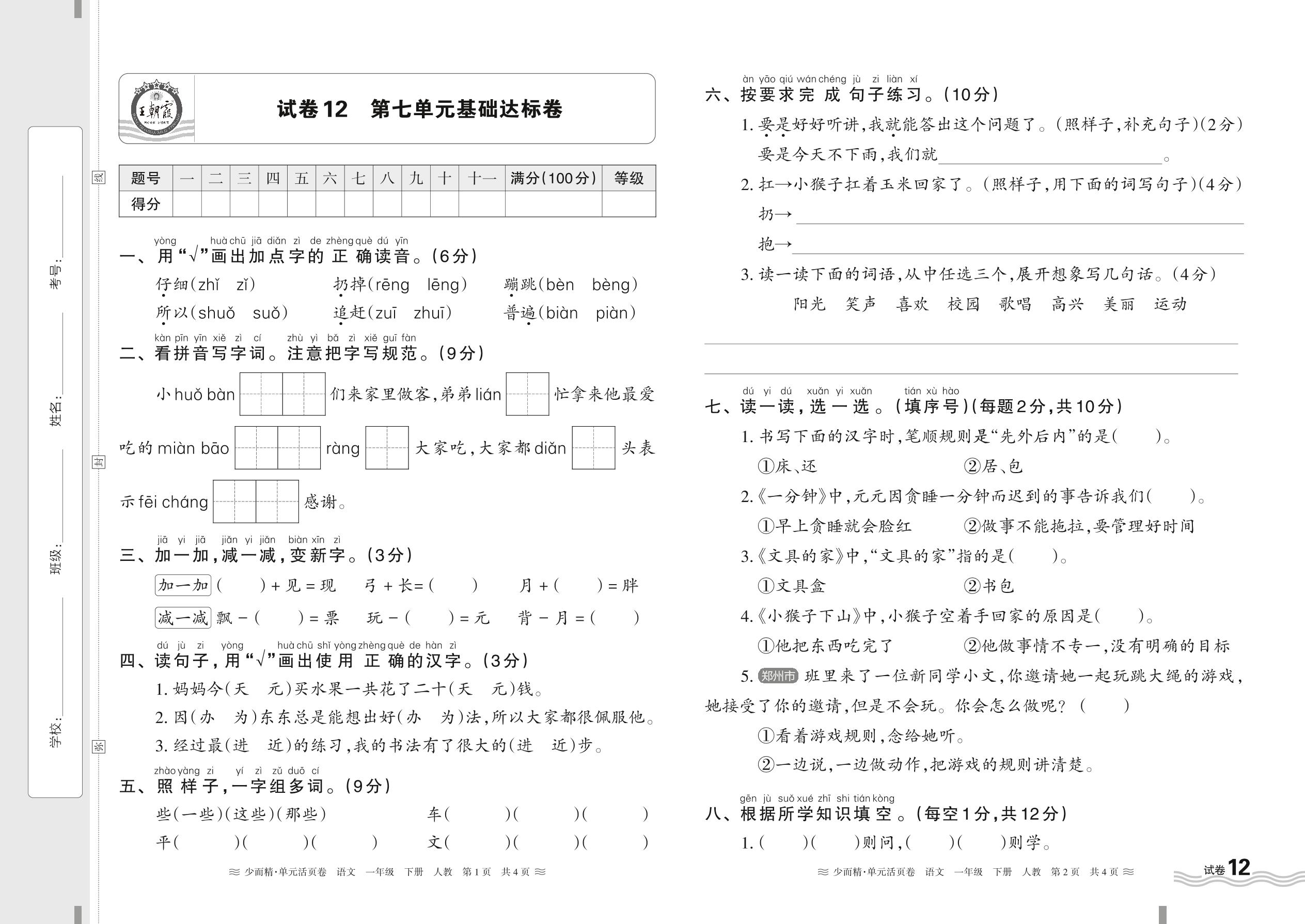 2024春下册一年级语文人教版 第七单元基础达标卷【12】