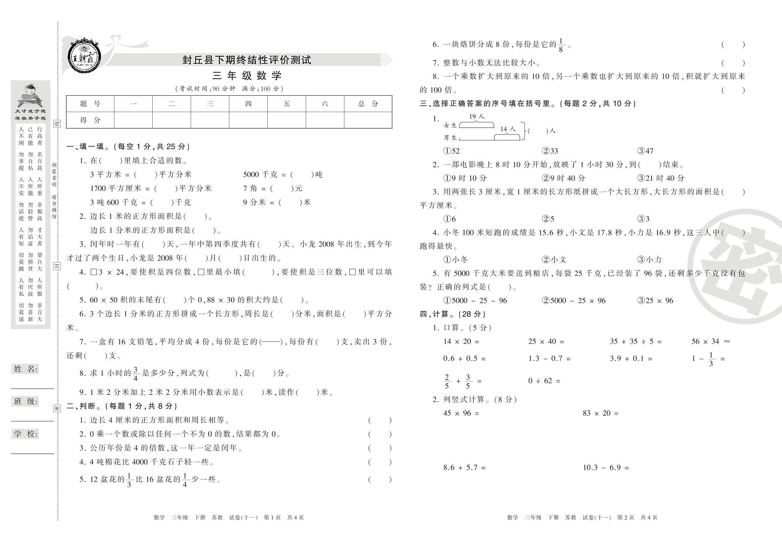 2015-2016学年第二学期新乡市封丘县三年级数学试卷(苏教版)【11】