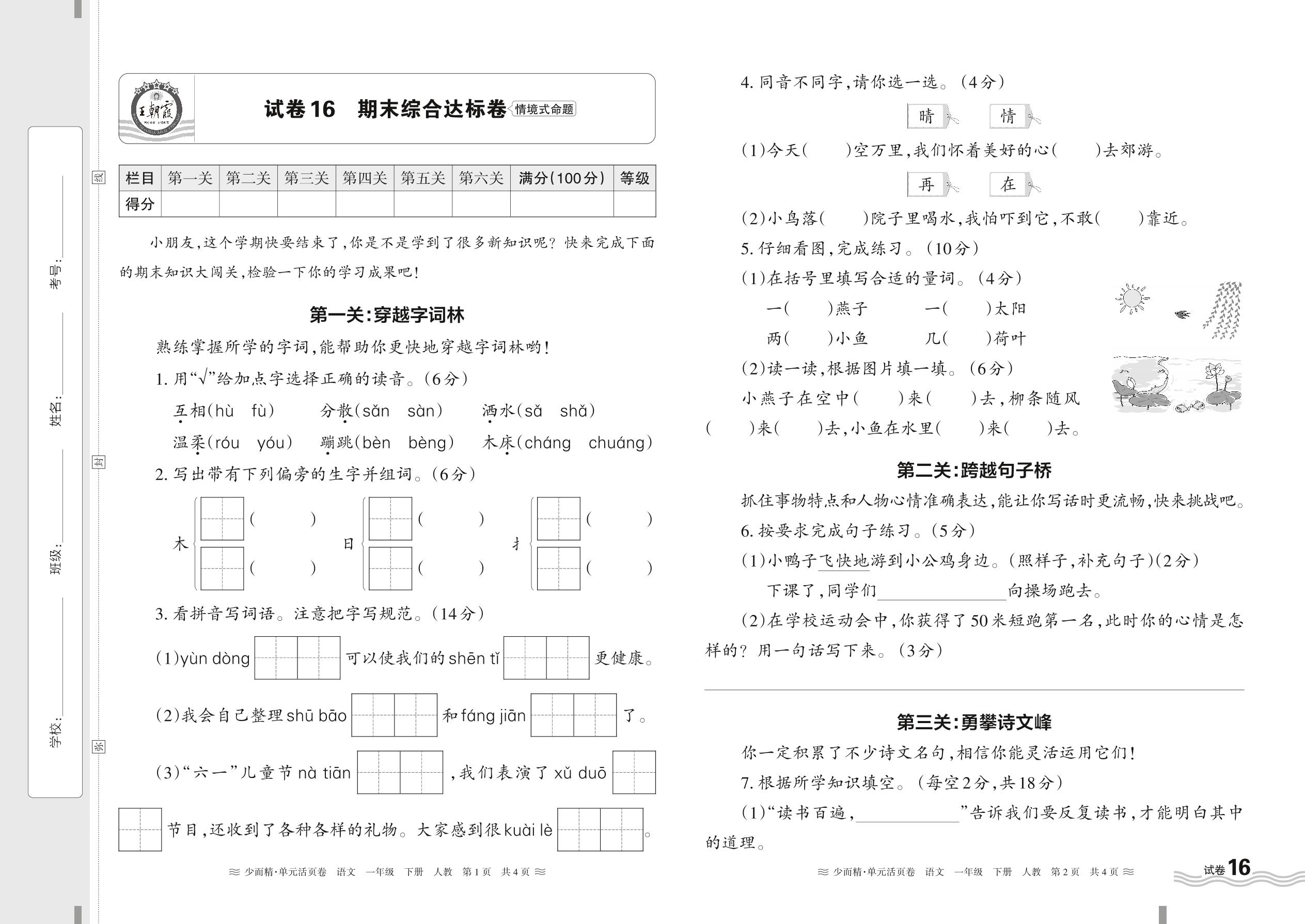 2024春下册一年级语文人教版 期末综合达标卷【16】