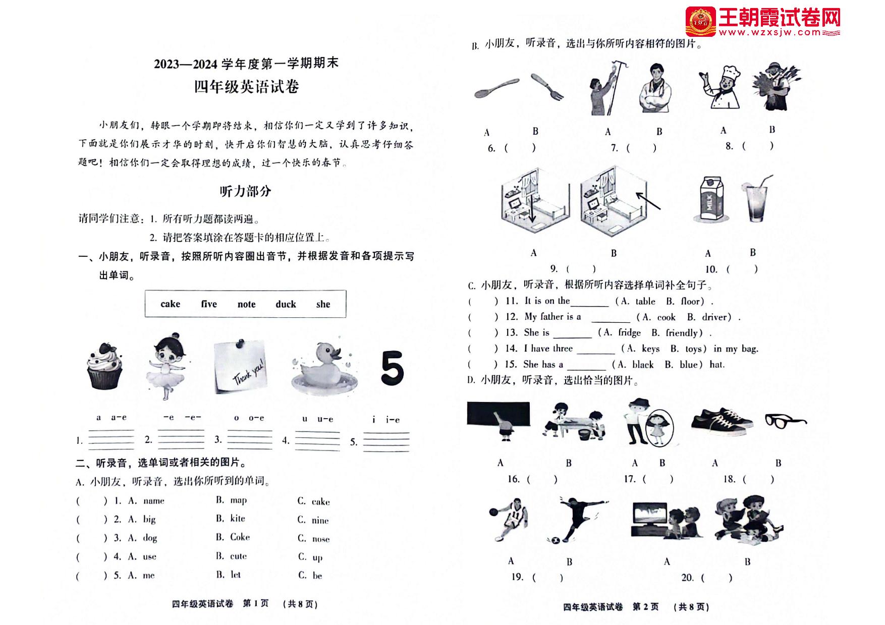 河北省廊坊市三河市2023-2024学年度第一学期期末试卷四年级英语(人教PEP版)【无听力音频】