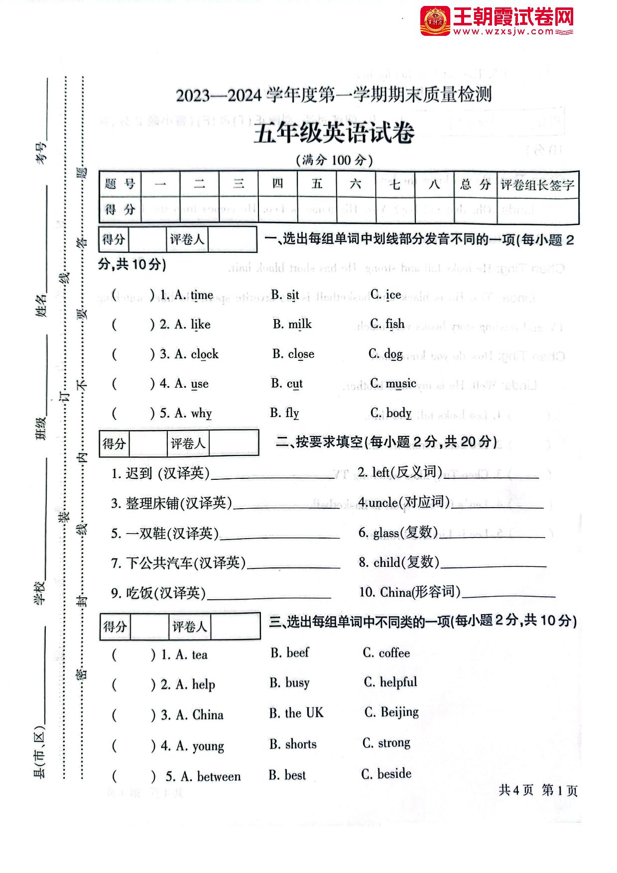 甘肃省定西市安定区2023-2024学年度第一学期期末质量检测试卷五年级英语(陕旅版)【无听力音频】