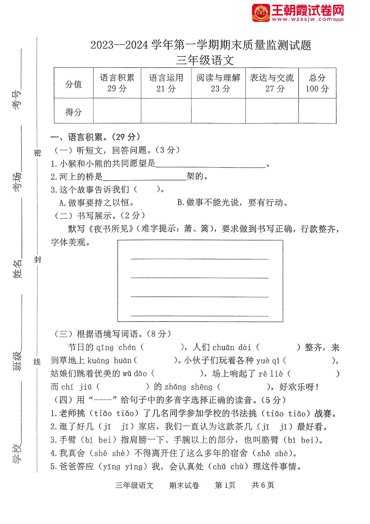 三年级语文人教版上册期末卷