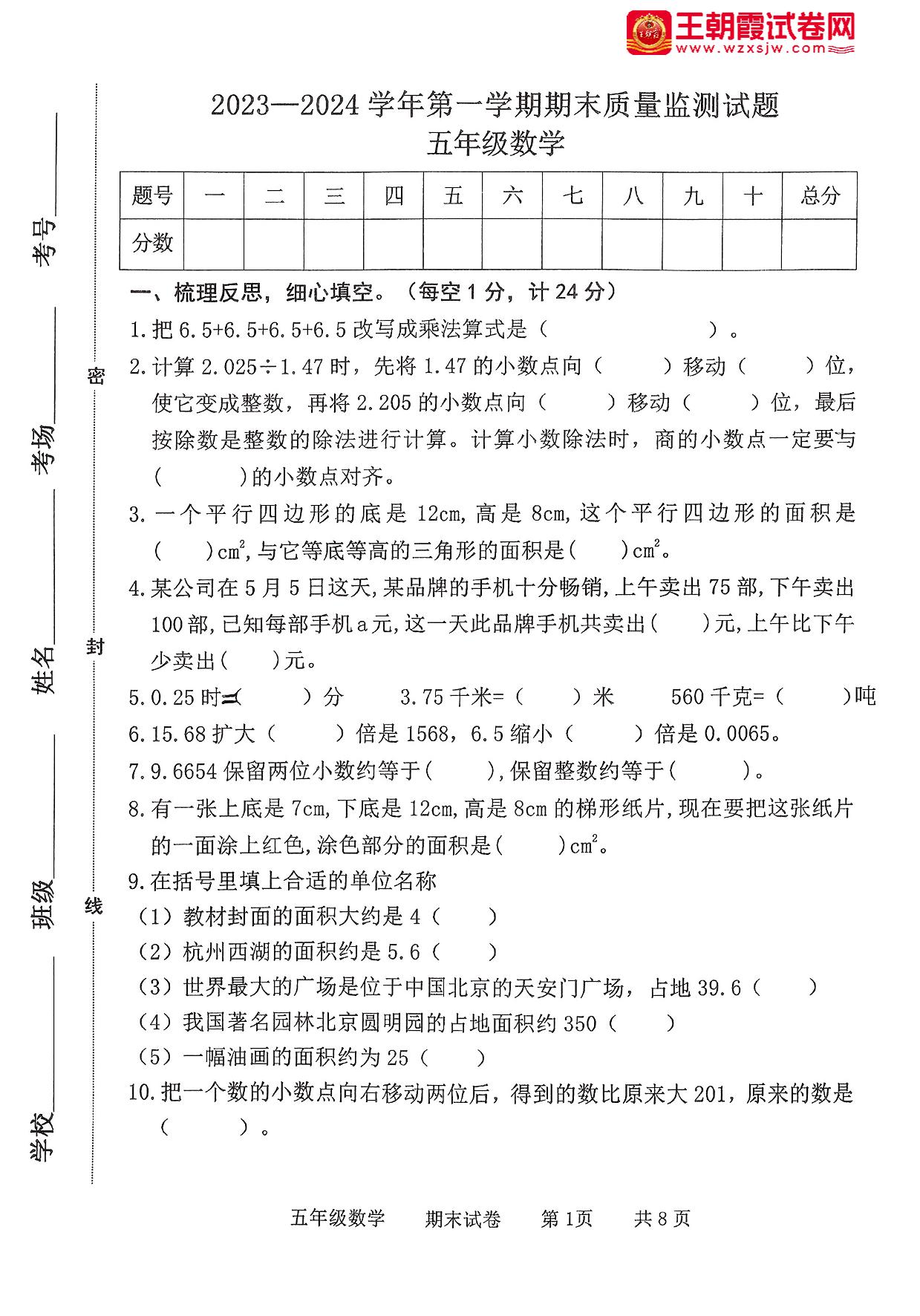 河北省承德市兴隆县2023-2024学年第一学期期末质量监测试题五年级数学(人教版)