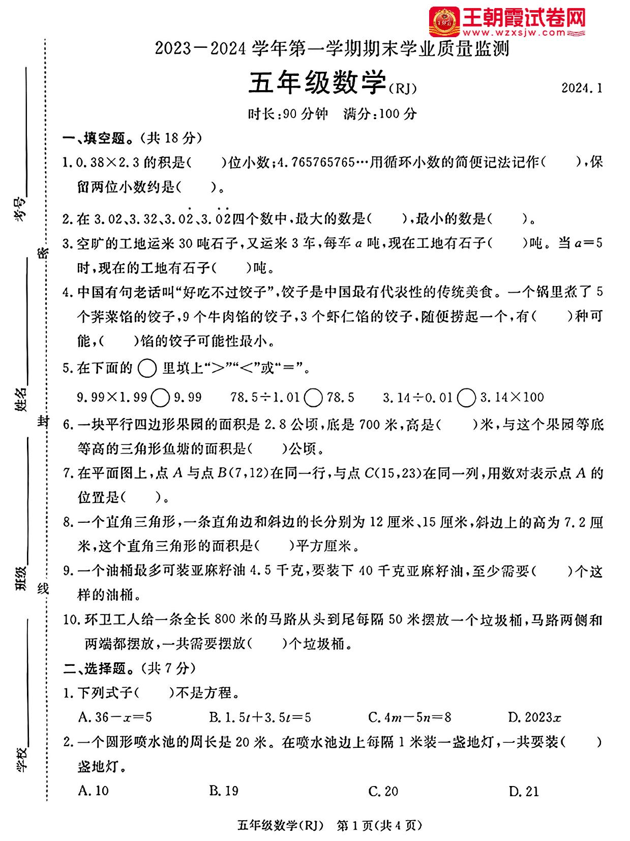 河北省廊坊市霸州市2023-2024学年第一学期期末学业质量监测五年级数学(人教版)
