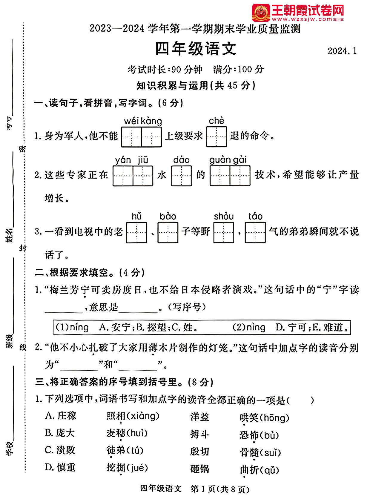 河北省廊坊市霸州市2023-2024学年第一学期期末学业质量监测四年级语文(人教版)