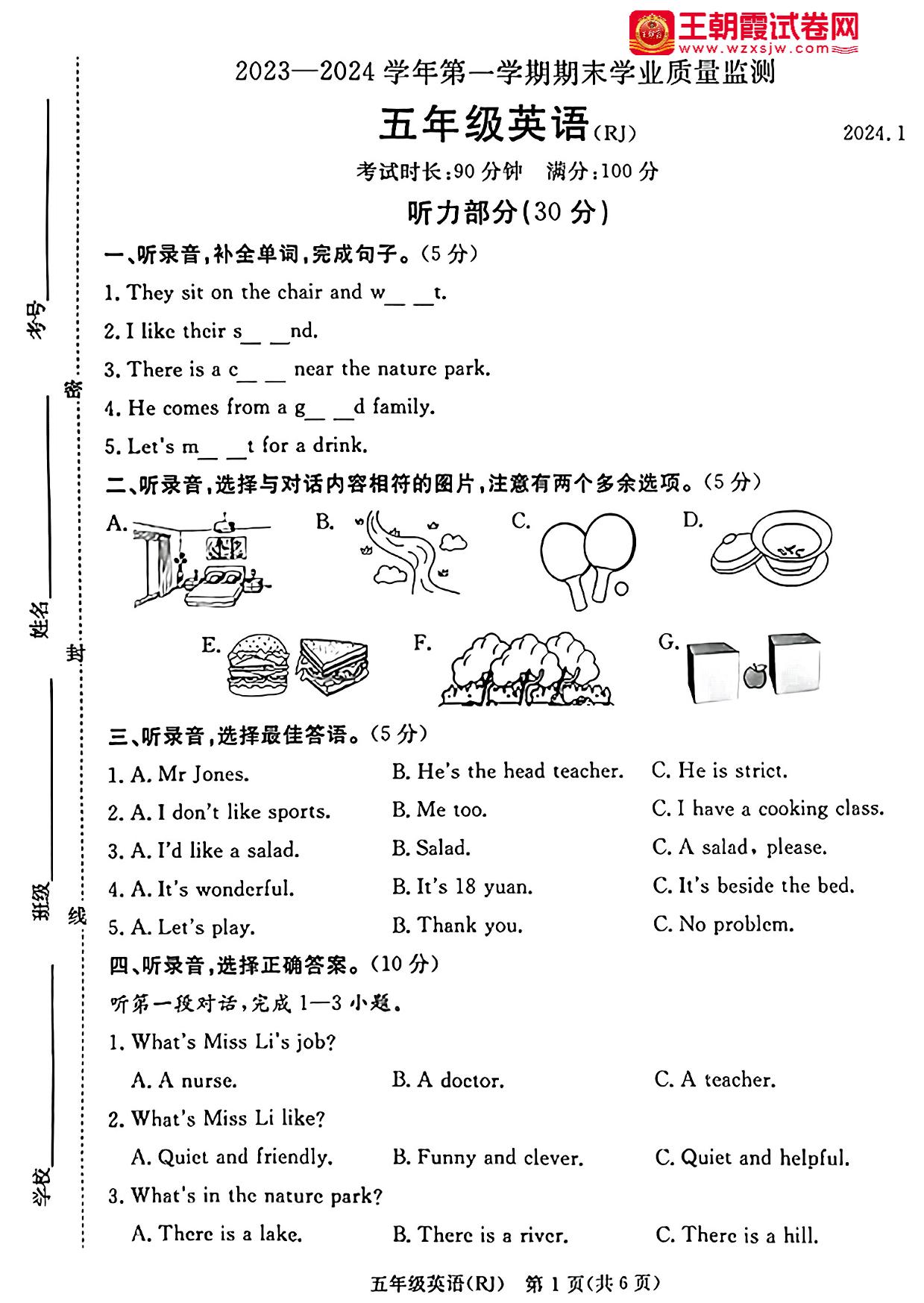 河北省廊坊市霸州市2023-2024学年第一学期期末学业质量监测五年级英语(人教PEP版)【无听力音频】