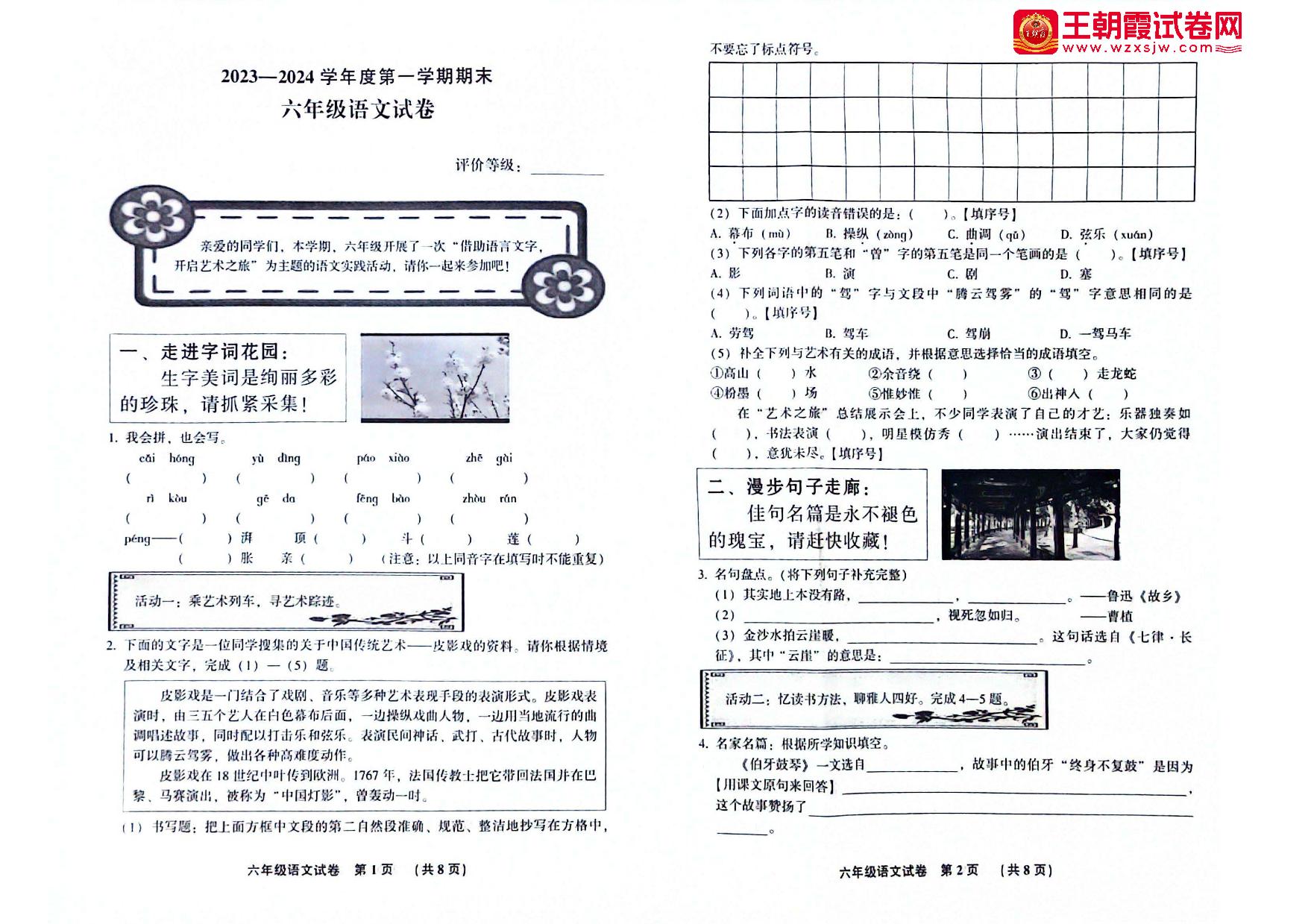 河北省廊坊市三河市2023-2024学年度第一学期期末试卷六年级语文(人教版)