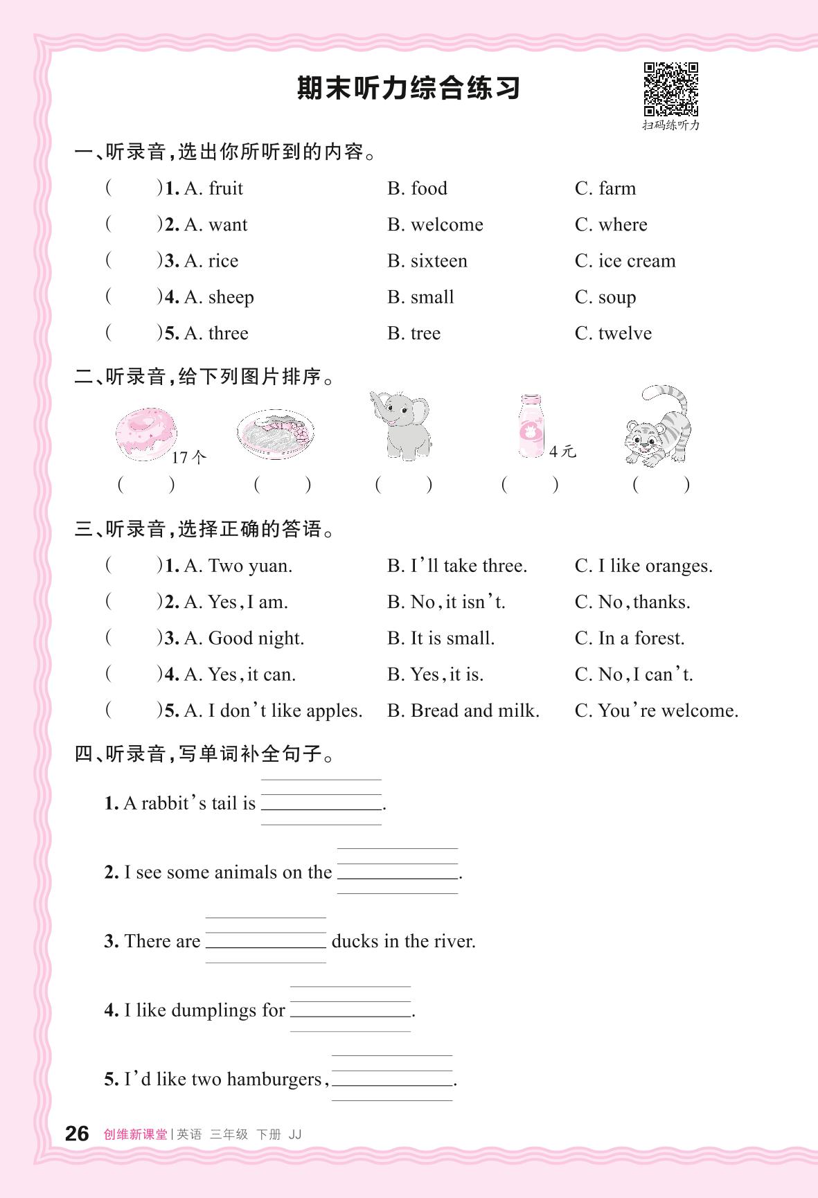 2024春下册三年级英语冀教版 期末听力综合练习