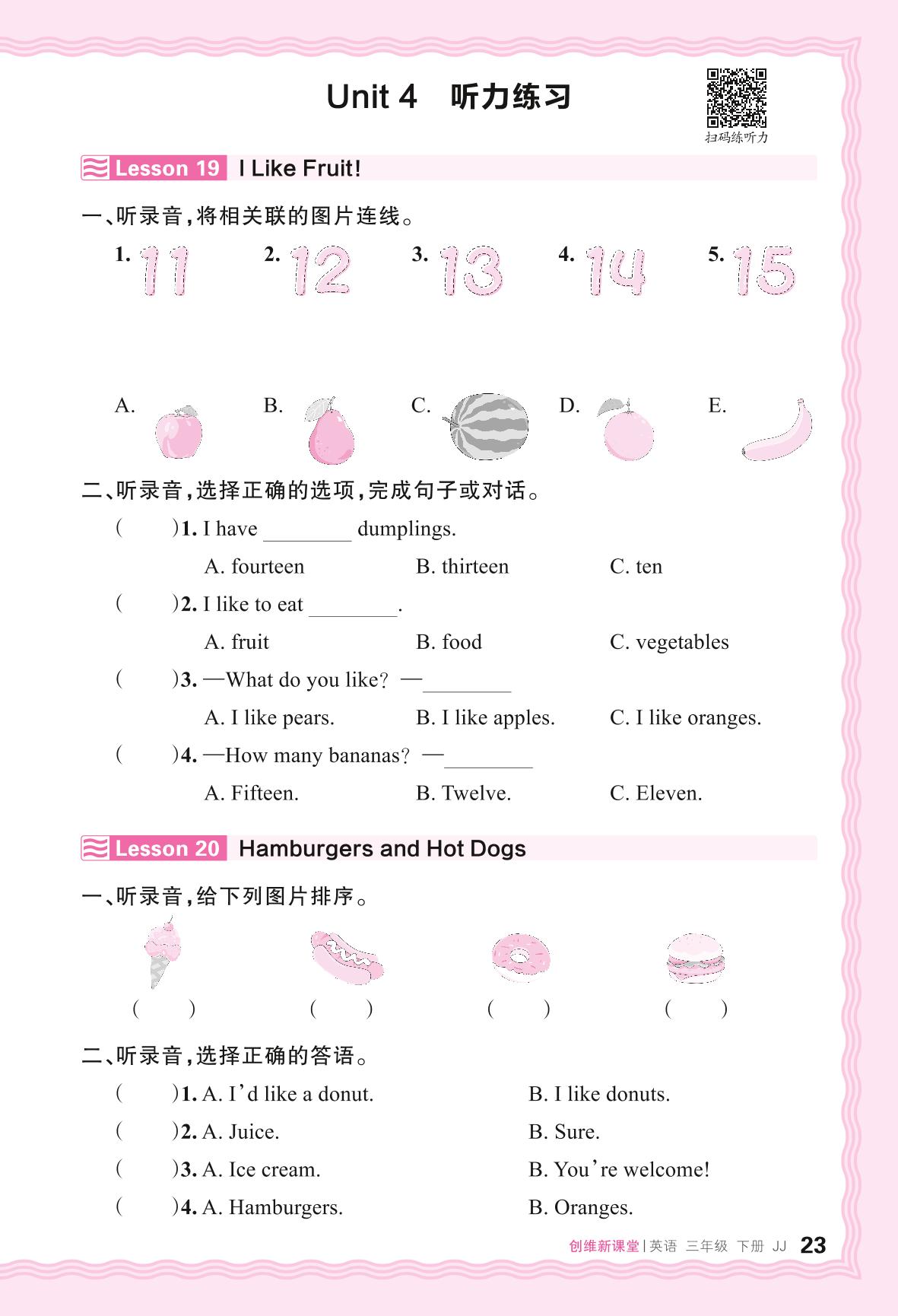 2024春下册三年级英语冀教版 Unit 4 听力练习