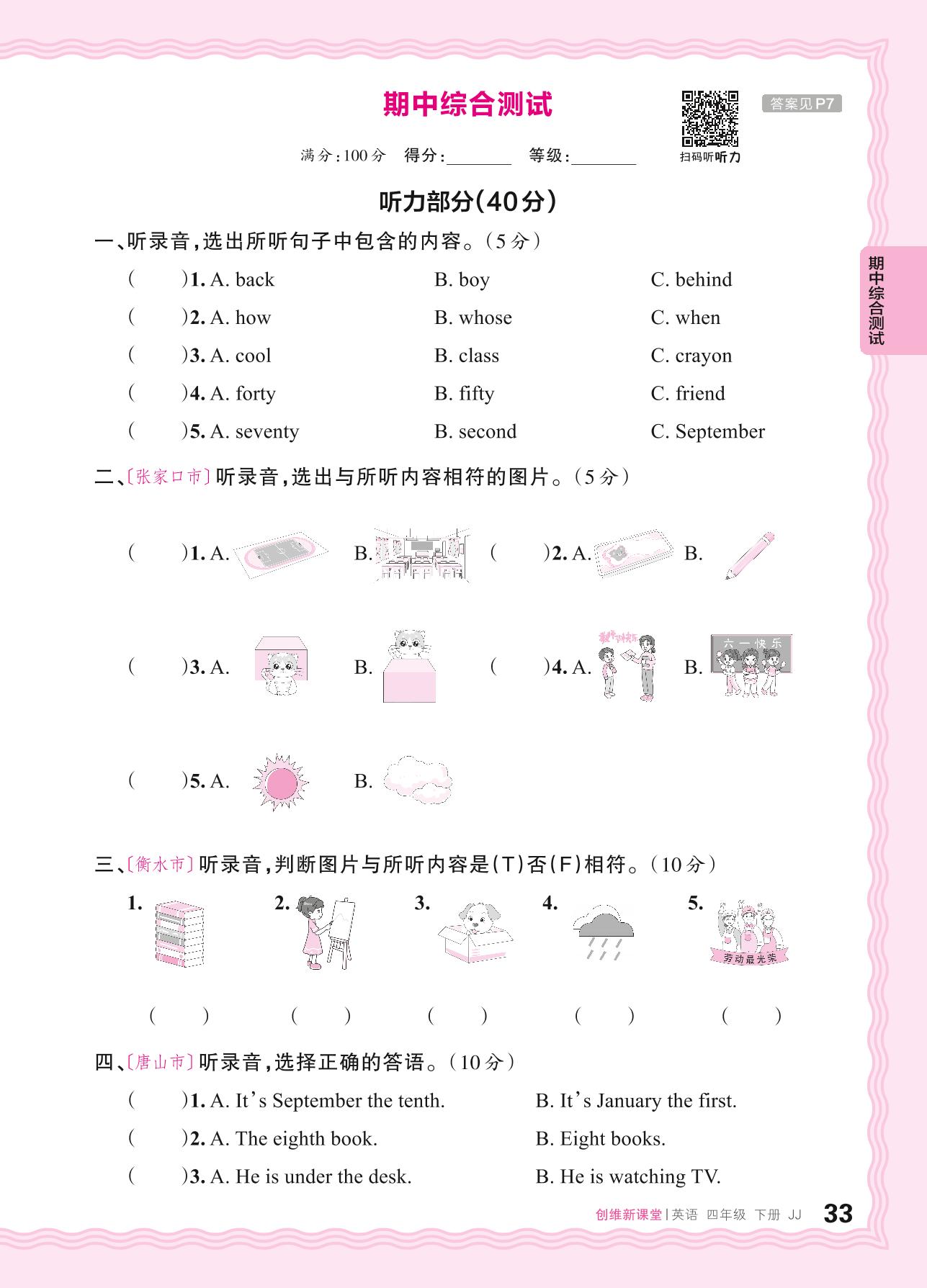 四年级英语冀教版下册期中卷