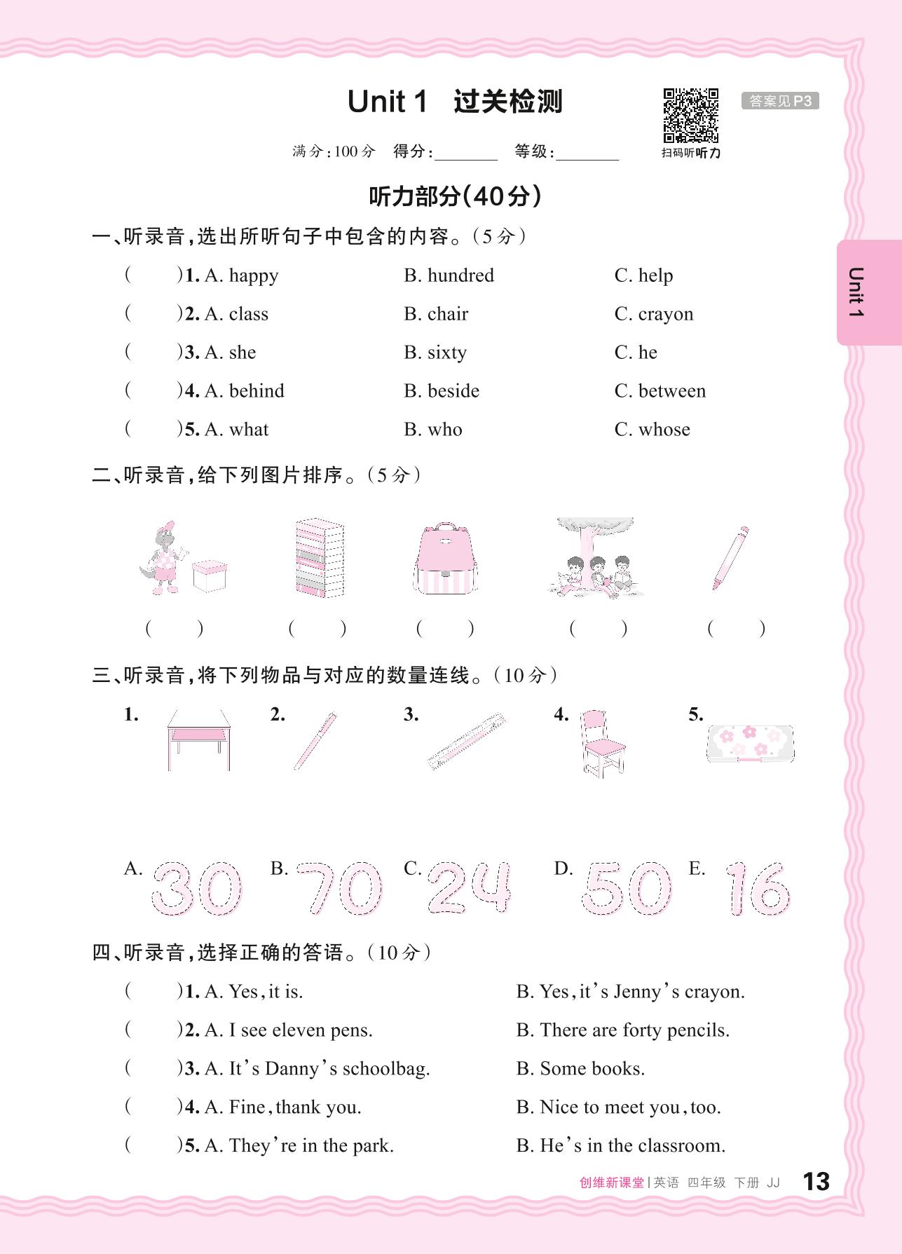2024春下册四年级英语冀教版 Unit 1 过关检测